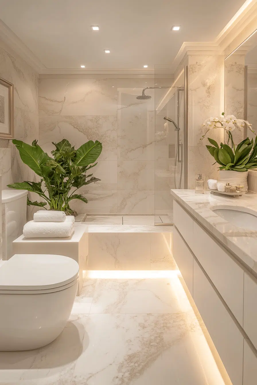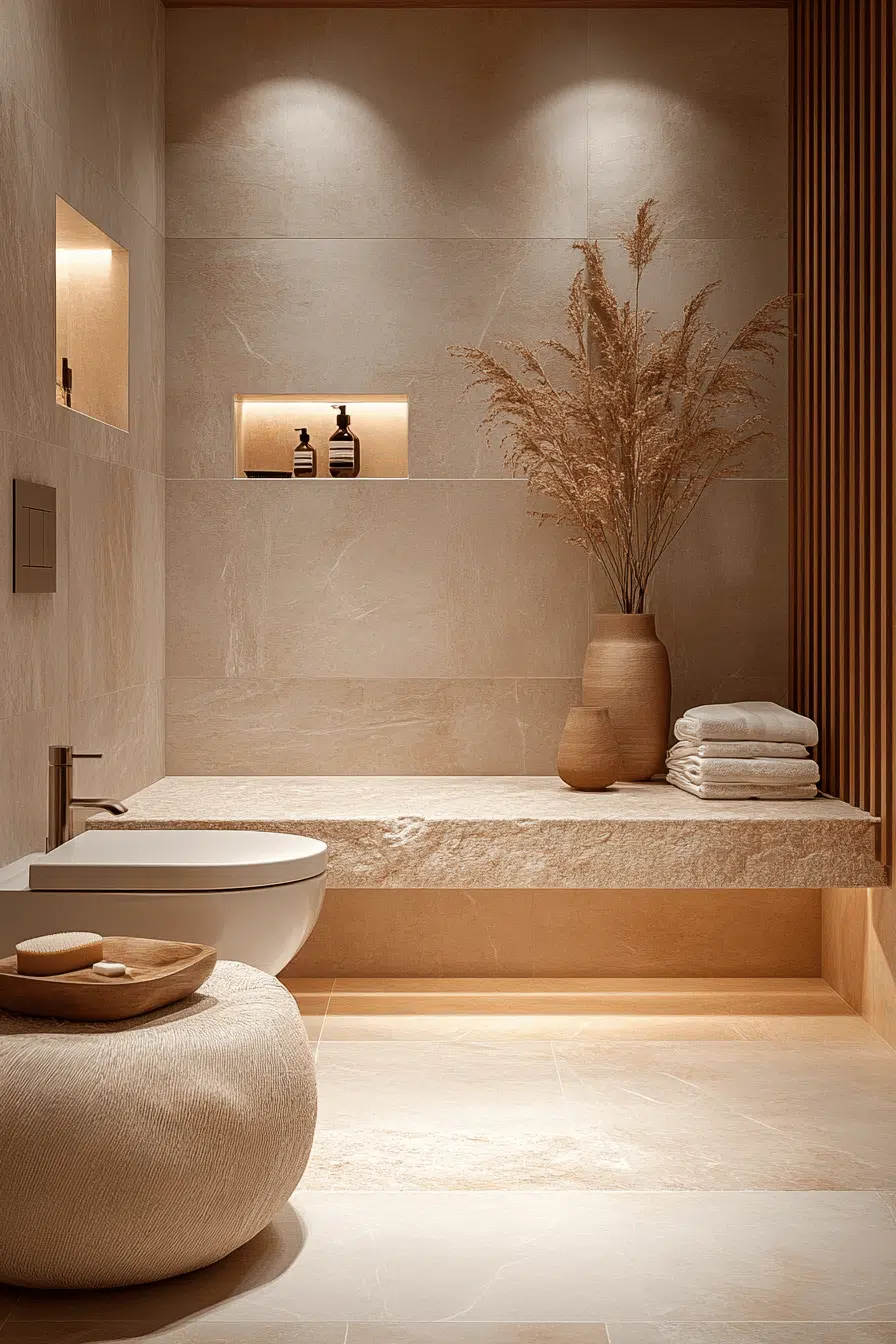 This refined compact setup shows how small guest bathroom ideas can feel elevated, polished, and intentionally designed. Sleek stone finishes, a floating vanity, and subtle gold details bring a sophisticated edge into the space. Soft layered lighting reflects beautifully across glossy surfaces, helping the room feel brighter and more open. A palette of warm neutrals, creamy taupes, and soft ivory tones creates a welcoming, upscale mood. Every element feels curated, from streamlined fixtures to neatly styled countertop accents. See how to bring this luxe look into your own space!