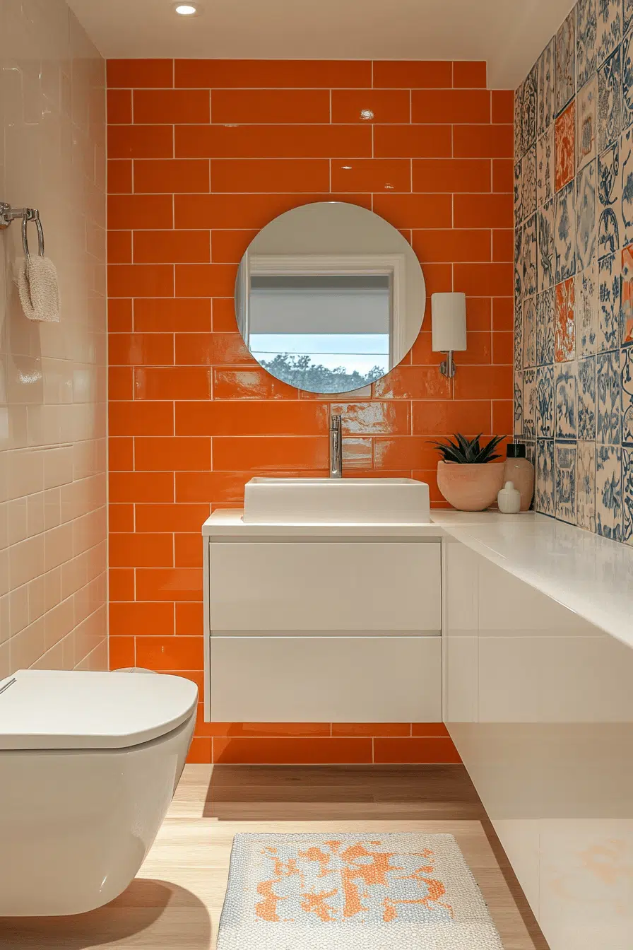 Glossy tile designs highlight small guest bathroom ideas that feel vibrant, bright, and full of personality. Reflective surfaces help expand the space visually while adding a fresh, energetic look. Subtle patterns introduce movement without overwhelming the room. Crisp white fixtures ground the design and keep everything polished. Small details like modern sconces or a sleek mirror complete the look. Bring a lively touch into your bathroom with this approach!