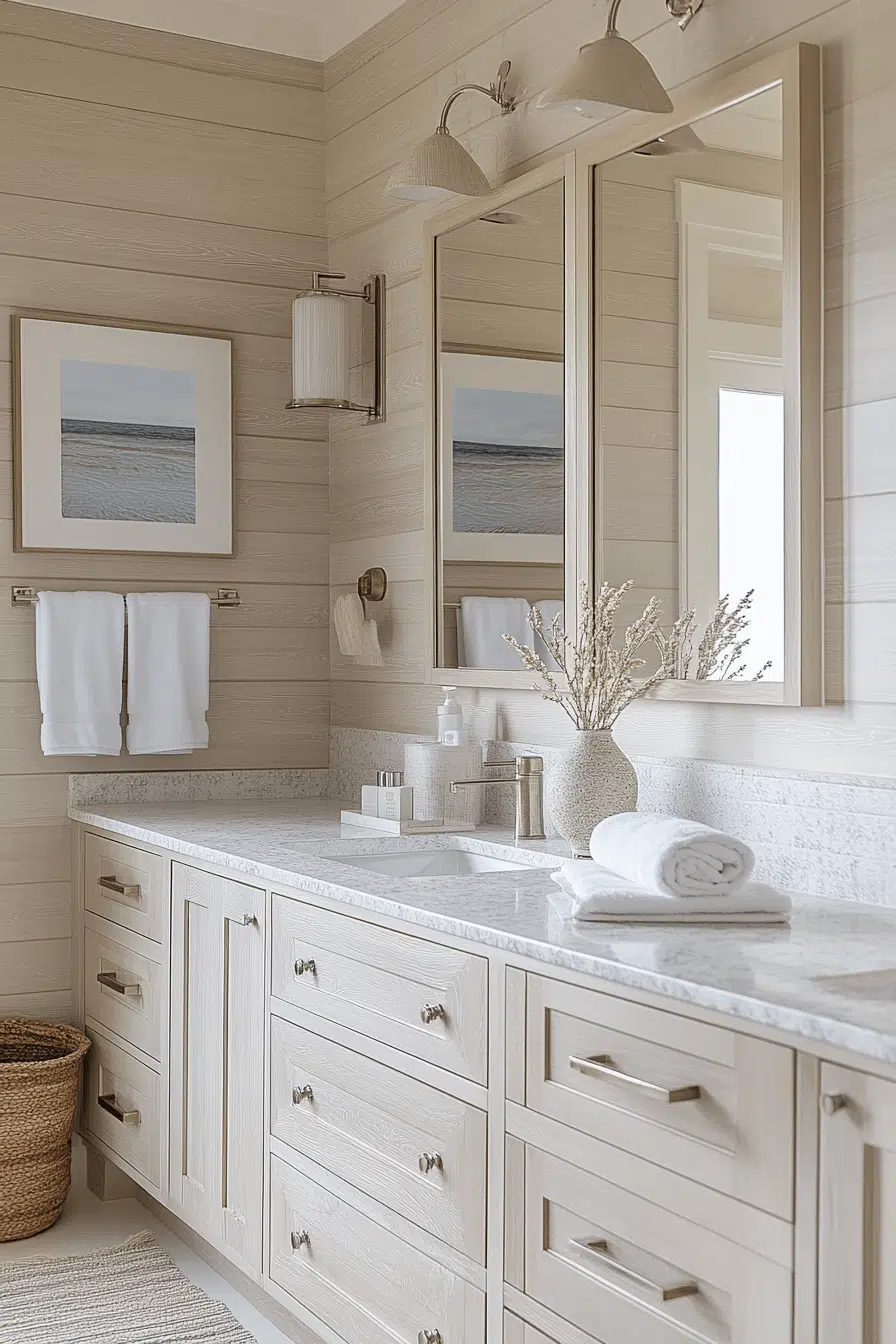 A breezy coastal influence transforms small guest bathroom ideas into light, refreshing spaces that feel relaxed and welcoming. Soft blues, sandy tones, and light wood accents create a calm seaside palette. Natural textures like woven details add warmth without overpowering the look. Bright lighting enhances the airy feel throughout the room. The overall design feels fresh and easygoing. Bring coastal calm into your bathroom today!