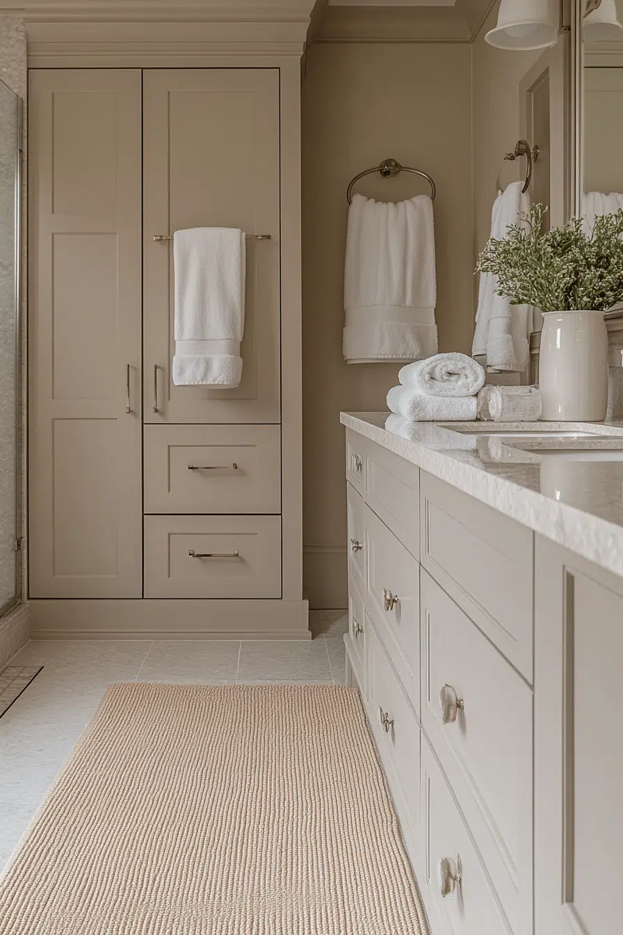 Soft neutral palettes define small guest bathroom ideas that feel calm, cozy, and effortlessly stylish. Creamy tones and gentle textures create warmth without heaviness. The simplicity of the palette helps the room feel open and balanced. Subtle decor adds interest while maintaining a relaxed vibe. Soft lighting enhances the soothing atmosphere. The result feels timeless and inviting. Create a calm retreat with neutral styling!