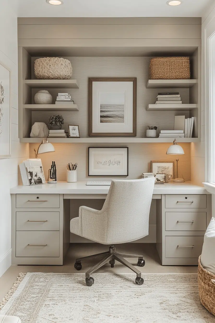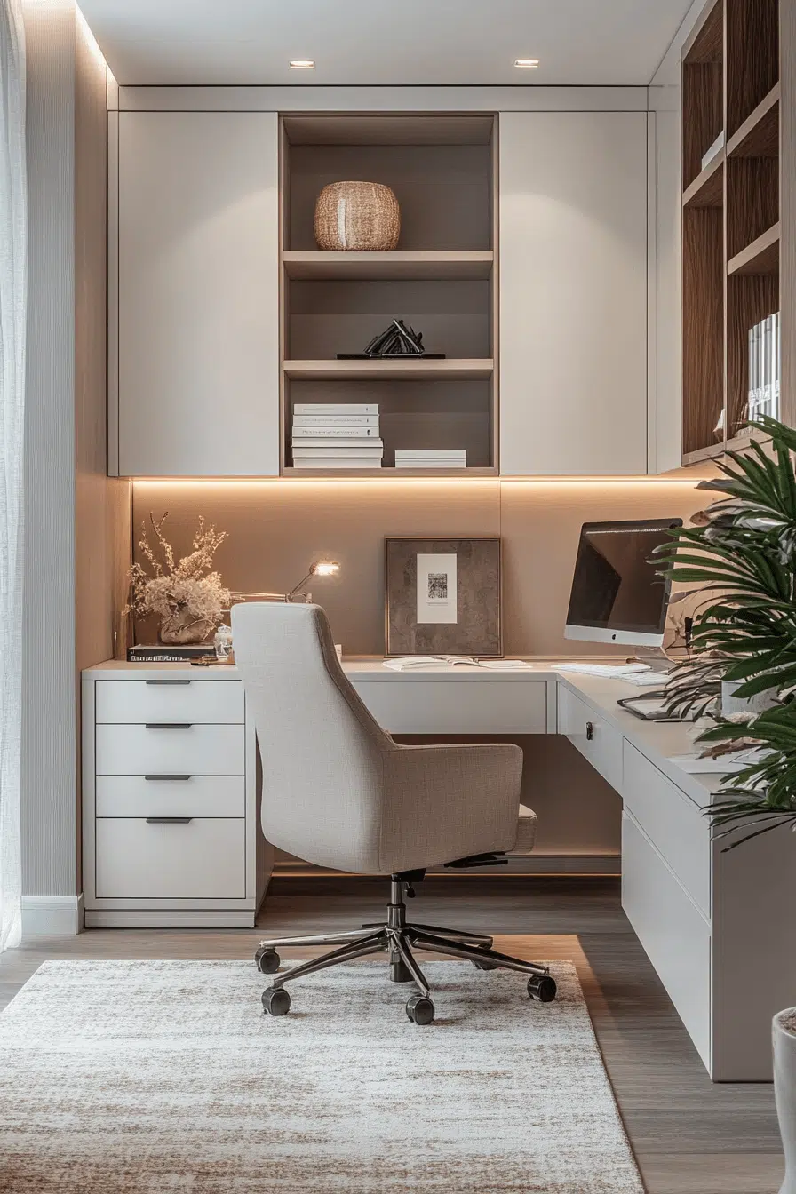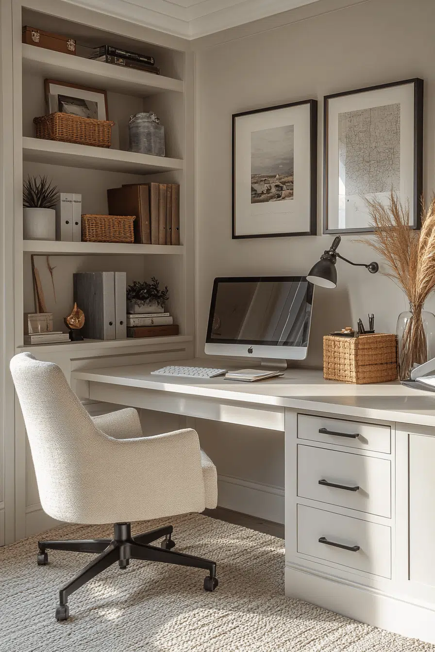 Concealed storage solutions keep everything organized while maintaining a clean aesthetic. Hidden compartments enhance small office decor by removing visual clutter. Built-in drawers maximize efficiency. Smooth surfaces maintain a polished look. Even small items stay out of sight. The space feels tidy and stress-free. Master organized simplicity today.