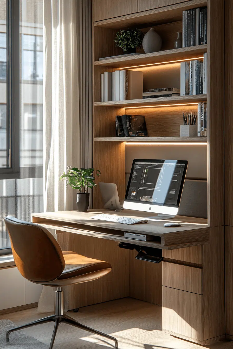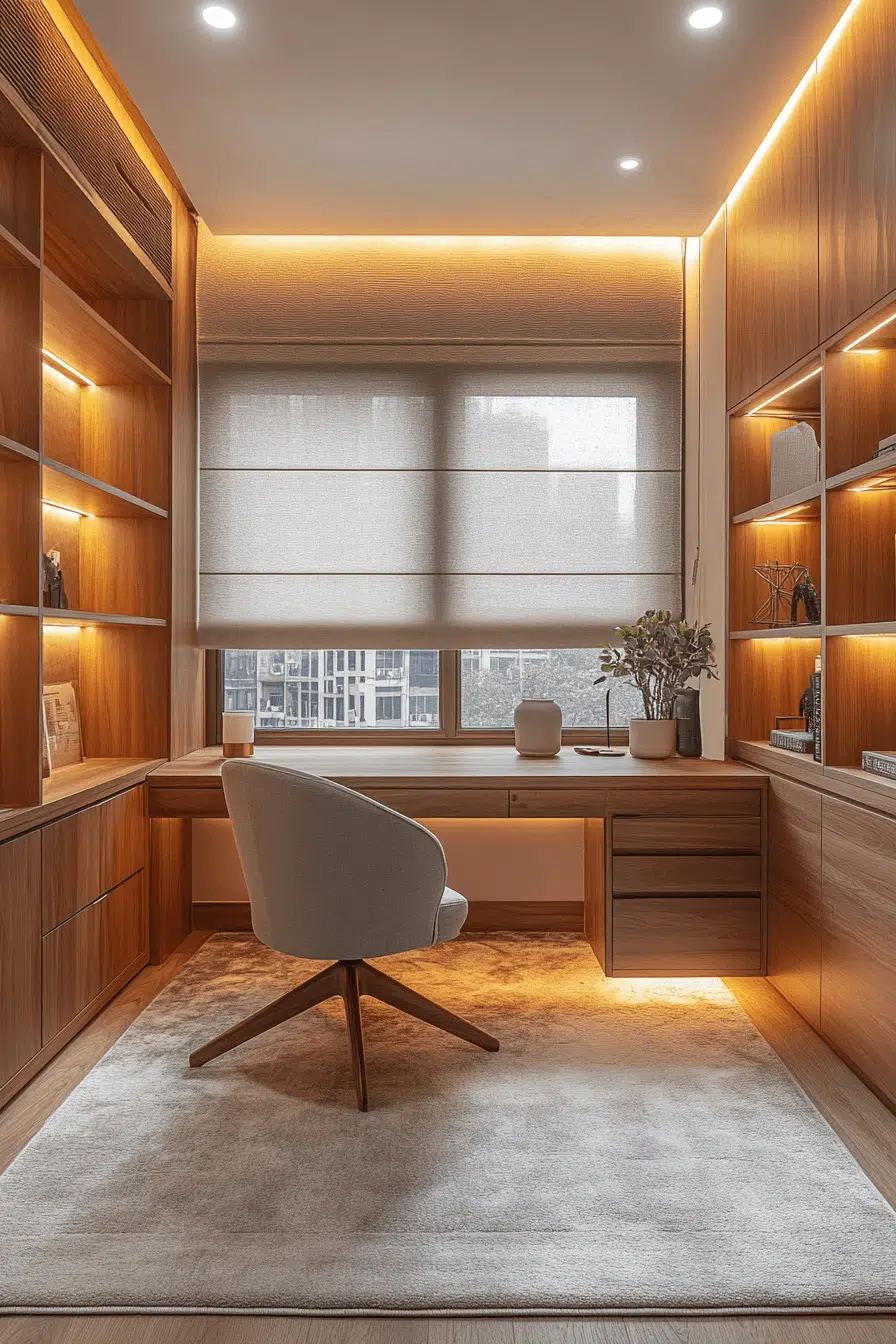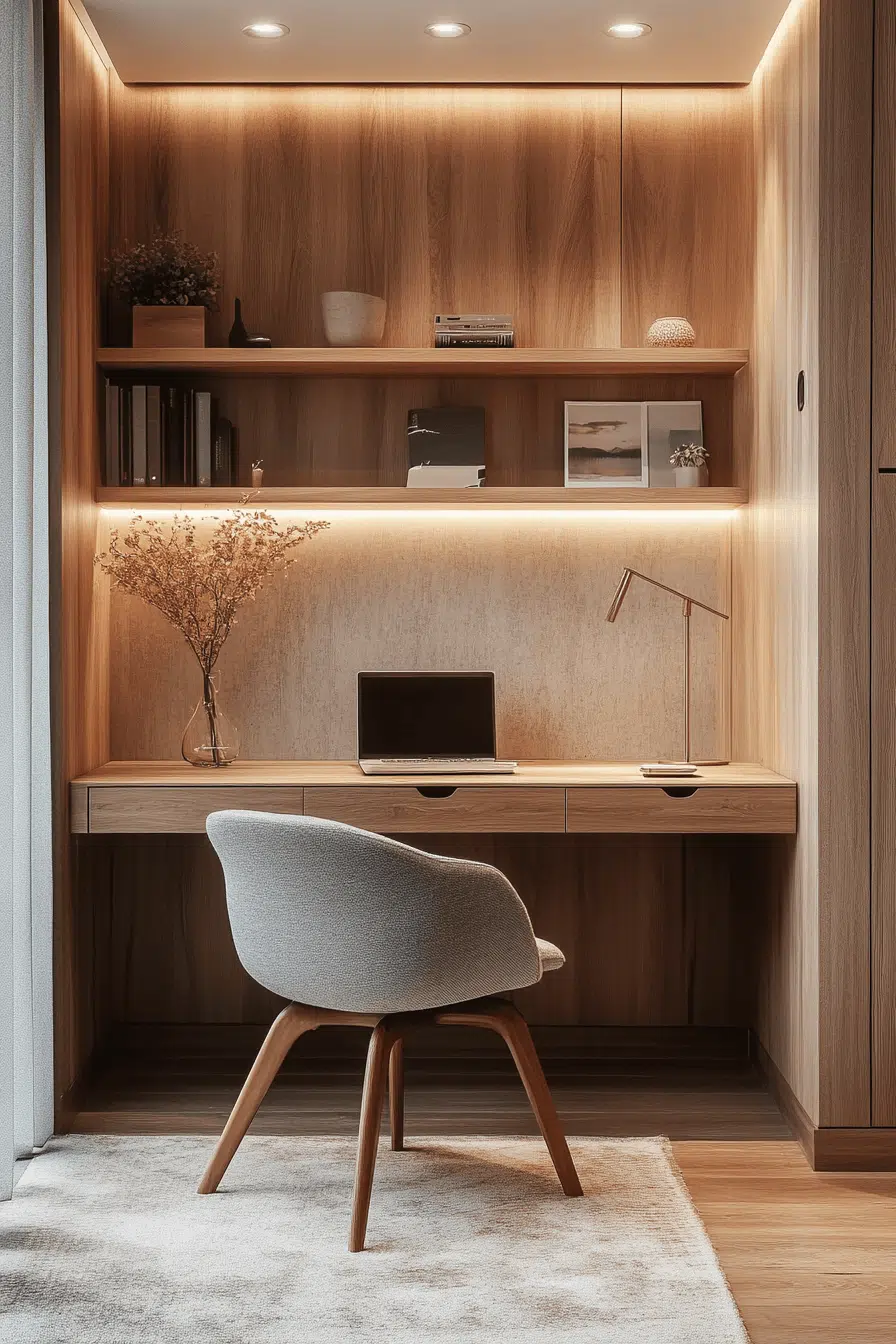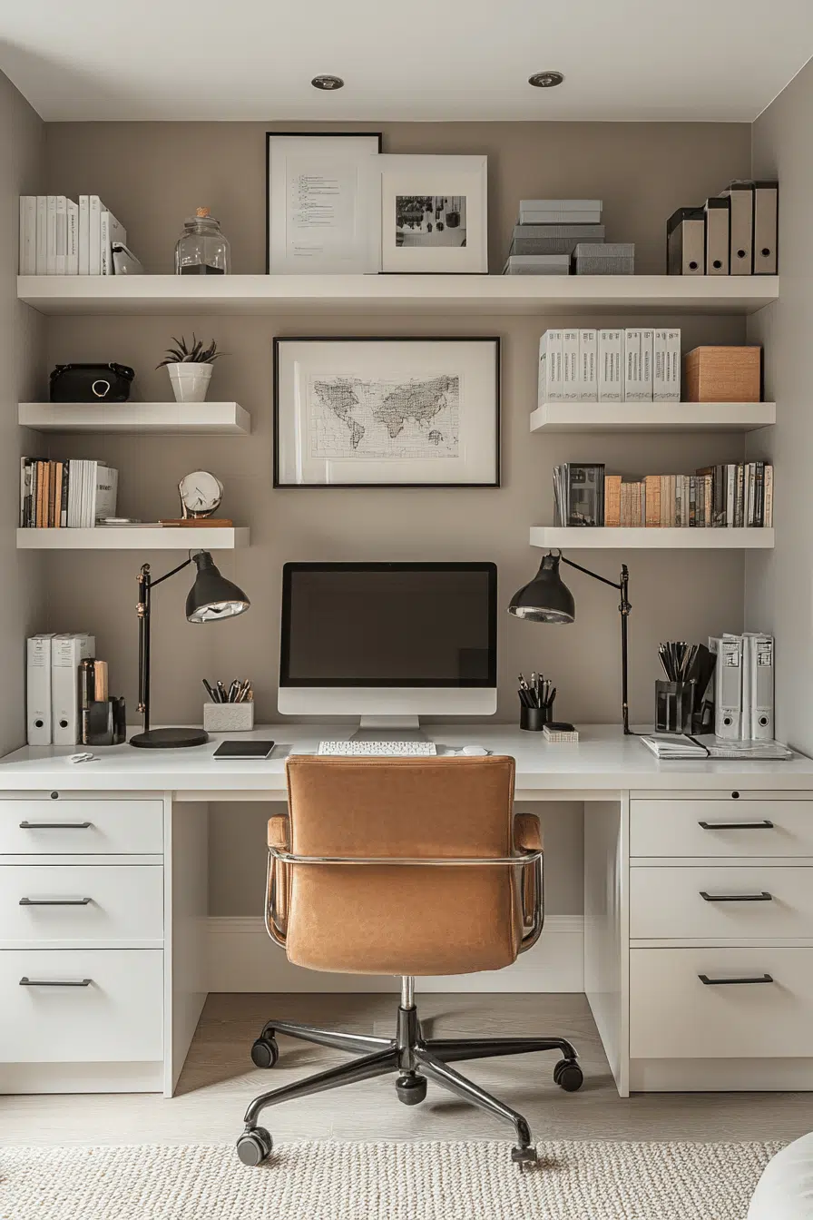 Concealed storage solutions keep everything organized while maintaining a clean aesthetic. Hidden compartments enhance small office decor by removing visual clutter. Built-in drawers maximize efficiency. Smooth surfaces maintain a polished look. Even small items stay out of sight. The space feels tidy and stress-free. Master organized simplicity today.