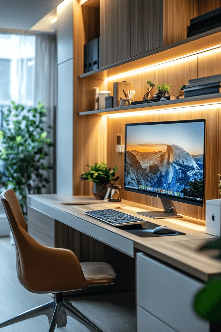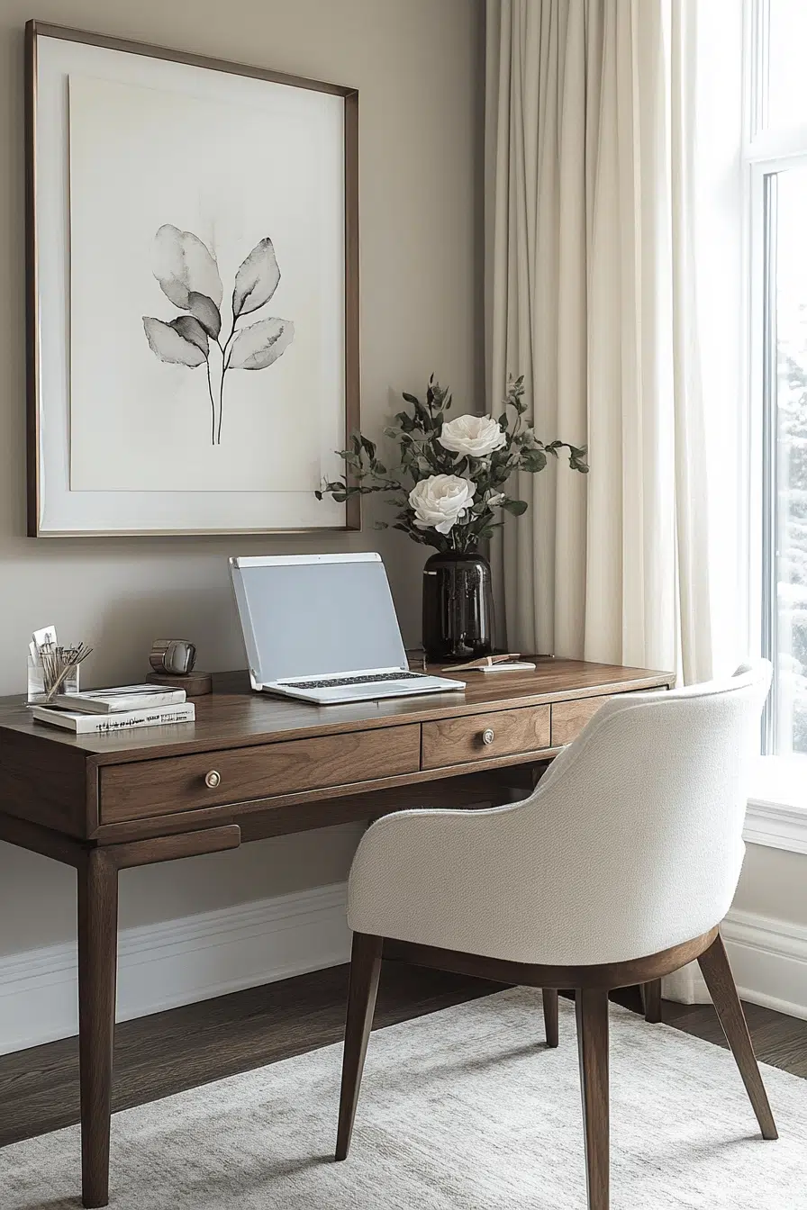 Streamlined surfaces and intentional styling create a workspace that feels sharp, focused, and distraction-free. A clean desk paired with subtle storage keeps small office decor organized while maintaining visual clarity. Soft ambient lighting reduces strain and supports long work sessions. Neutral tones keep the atmosphere calm and balanced. A single decorative piece adds personality without clutter. The result feels efficient and quietly motivating. Refresh your workflow with this clean setup.