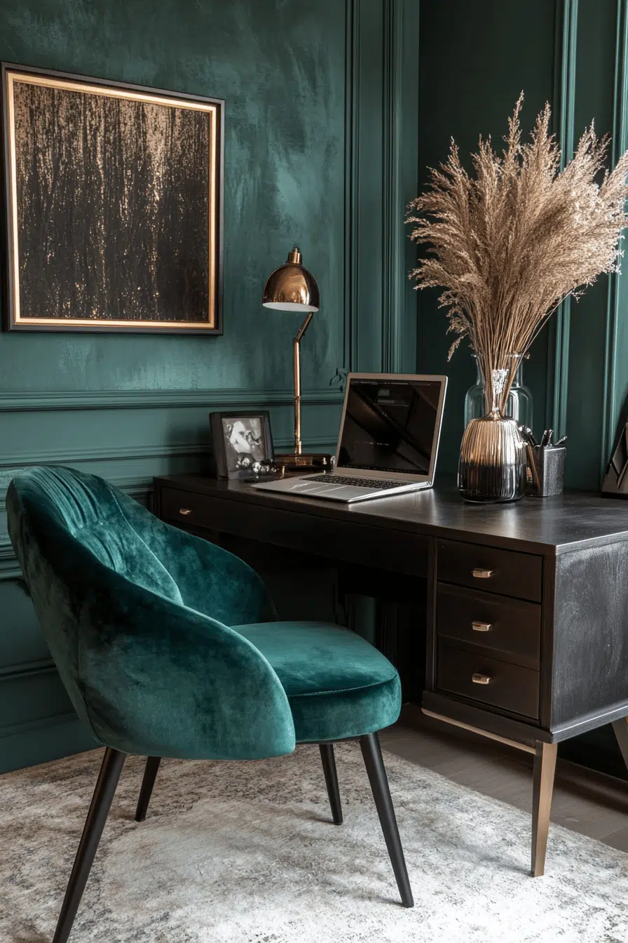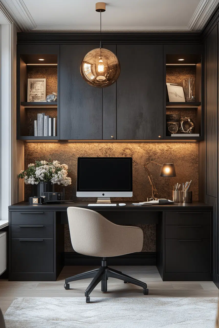 Dark finishes create a bold focal point that defines the workspace with confidence. Matte surfaces enhance small office decor by adding depth without clutter. Metallic accents introduce subtle contrast and polish. Balanced lighting prevents the space from feeling heavy. Compact furniture keeps everything efficient. The overall vibe feels sleek and powerful. Elevate your workspace with striking contrast.