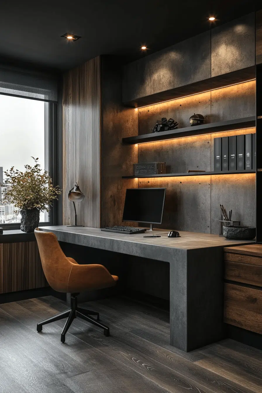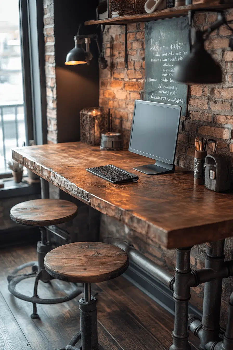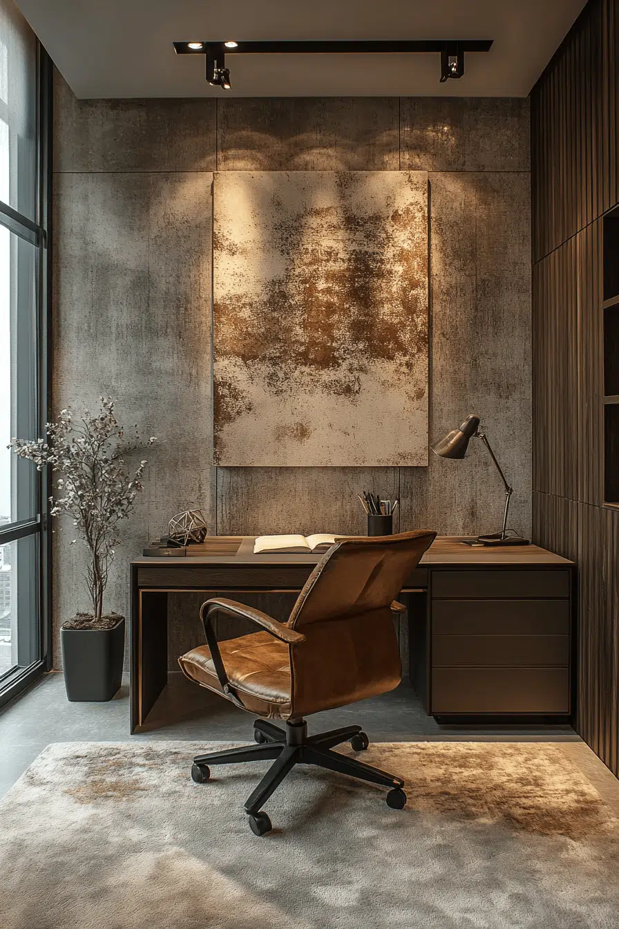 Industrial accents introduce bold structure and visual interest into compact workspaces. Raw materials enhance small office decor by creating contrast. Warm details soften the look for balance. Clean lines maintain clarity. Subtle lighting enhances the overall design. The mood feels creative and strong. Add an edgy touch to your office.