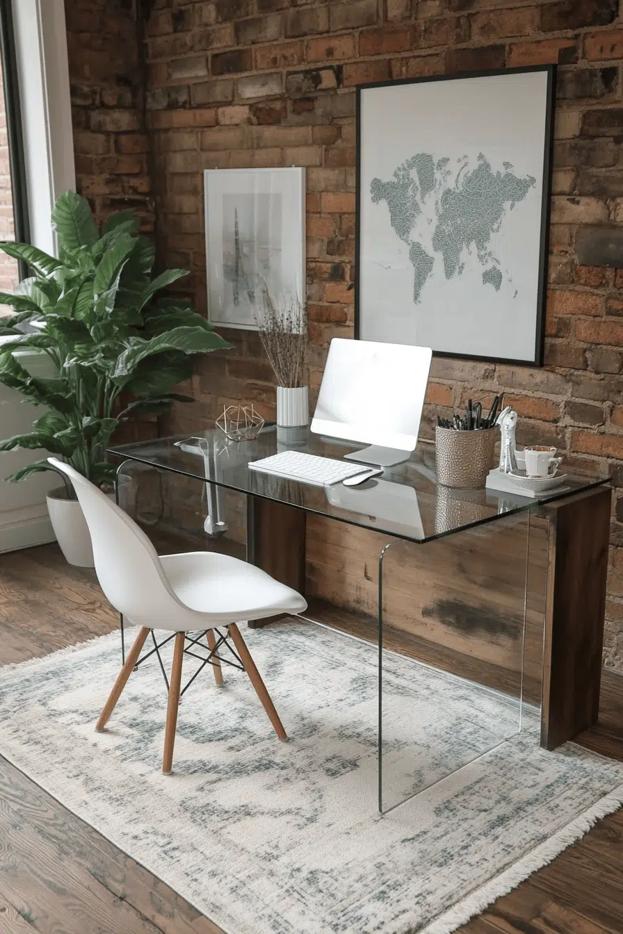 Transparent furniture introduces openness and lightness that instantly expands compact areas. A clear desk enhances small office decor by minimizing visual weight while maximizing brightness. Slim seating keeps the arrangement sleek and functional. Reflective elements bounce light throughout the room. Minimal accents maintain a polished look. The space feels airy and modern. Brighten your office with this light-forward design.
