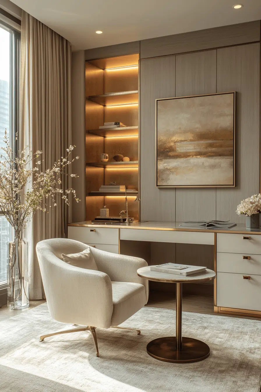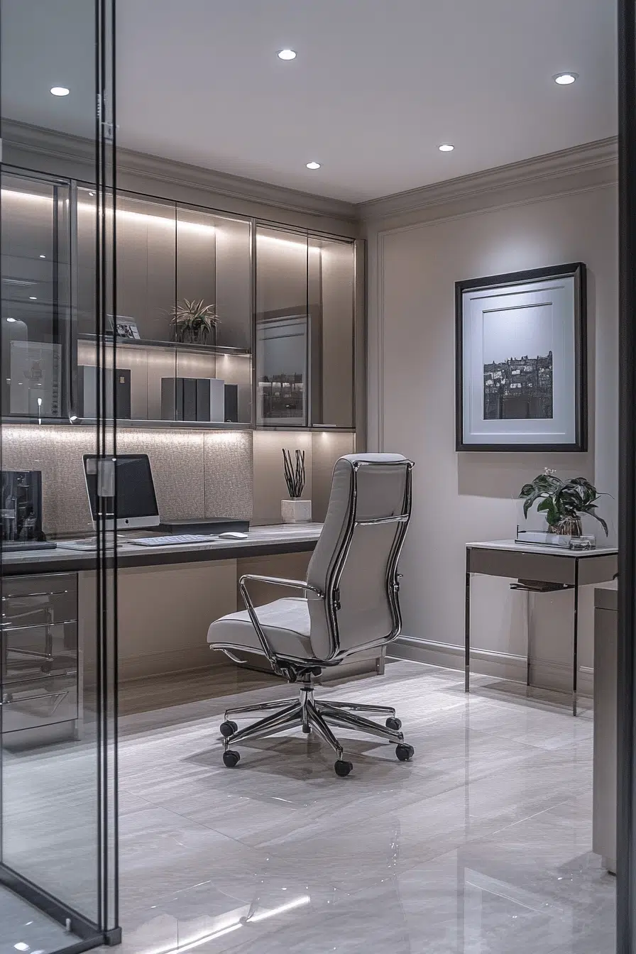 Refined details and compact layouts create a workspace that feels polished and efficient. Smooth finishes enhance small office decor by adding a touch of sophistication. Metallic accents introduce subtle shine. Streamlined furniture keeps everything purposeful. Soft lighting completes the look. The space feels motivating and stylish. Upgrade your office with refined design.