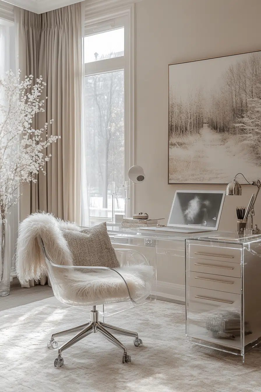 Clear furniture keeps the layout open while maintaining full functionality. Transparent materials enhance small office decor by reducing visual clutter. Light flows freely across surfaces. Subtle accents maintain a modern aesthetic. Clean lines keep everything cohesive. The space feels bright and effortless. Discover a lighter way to design your office.