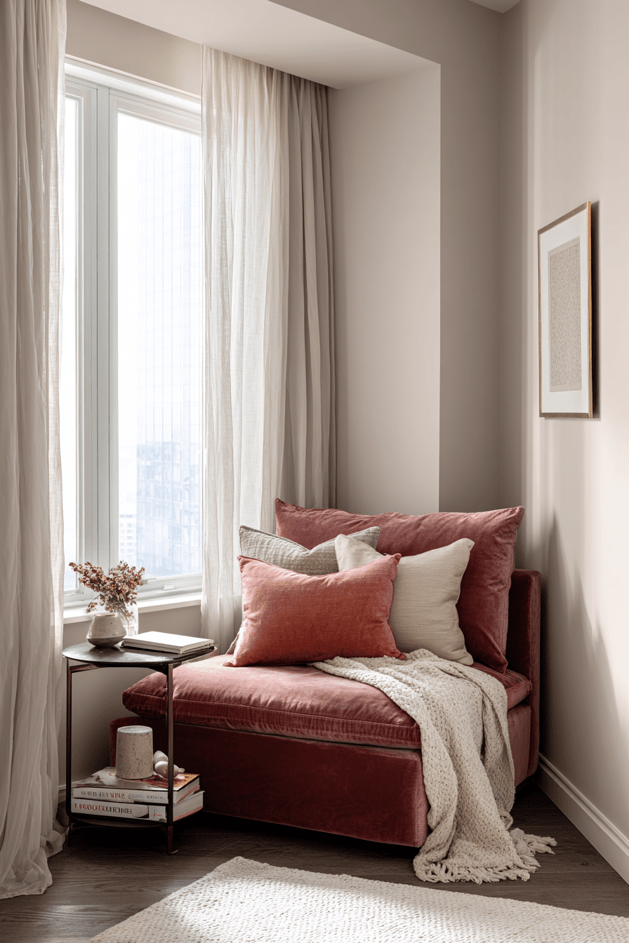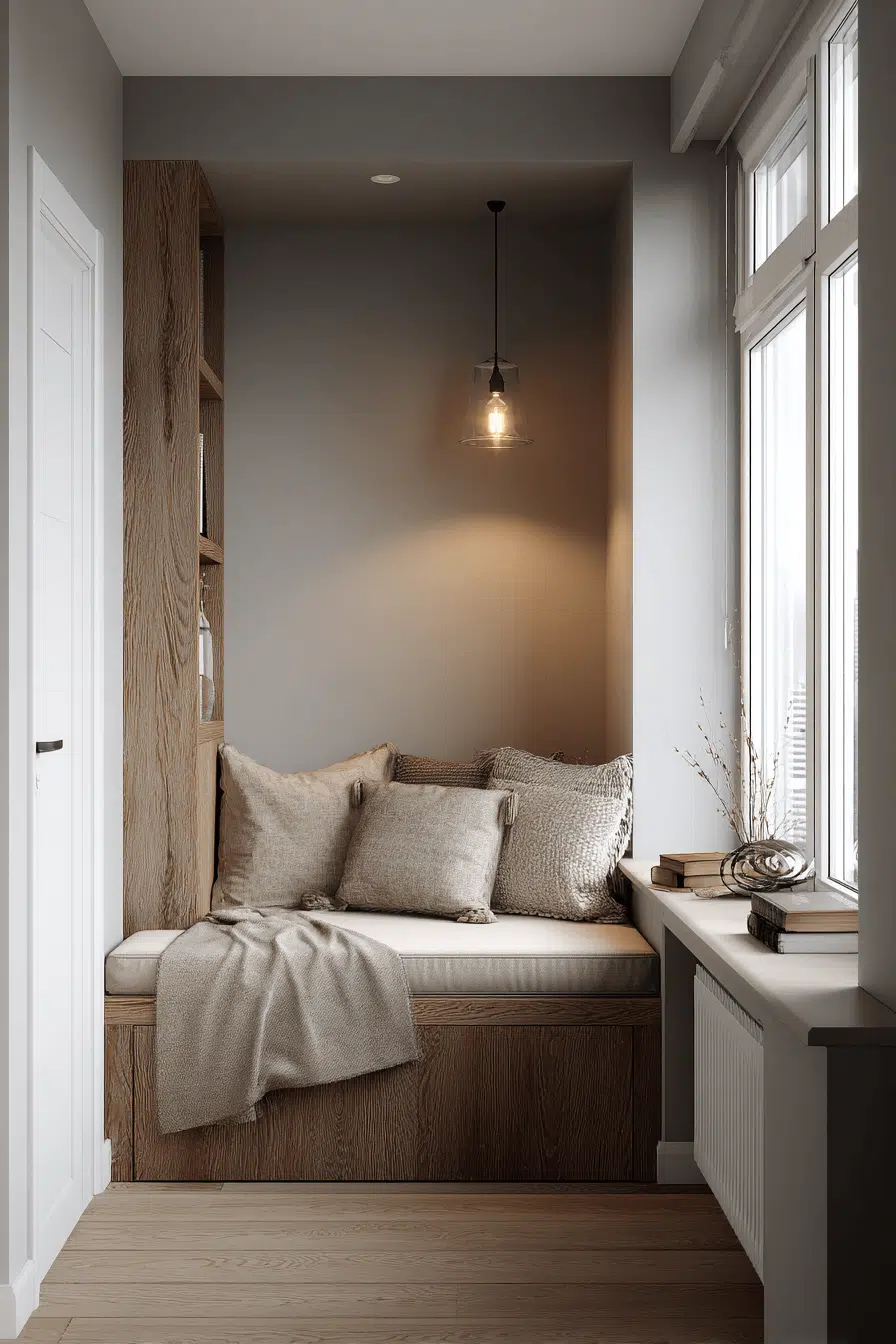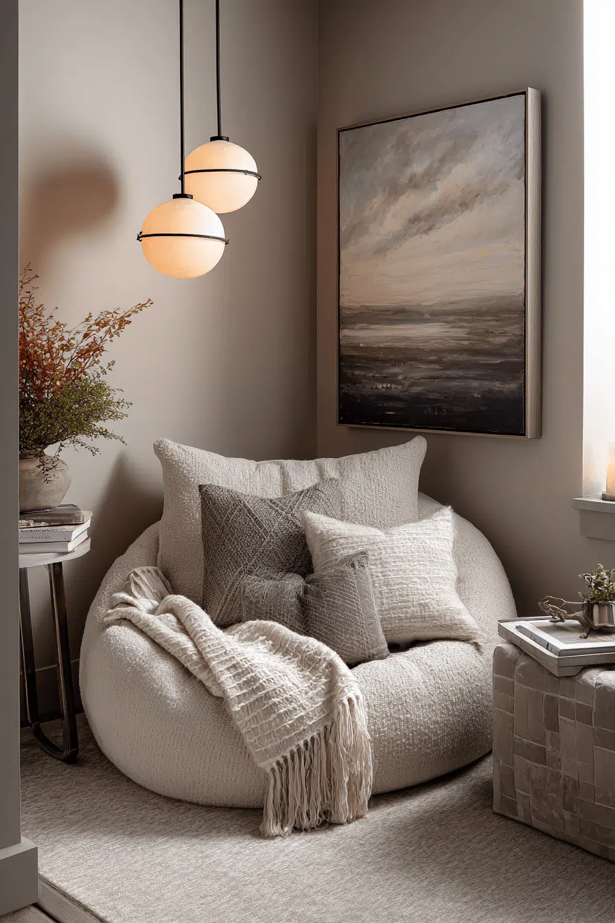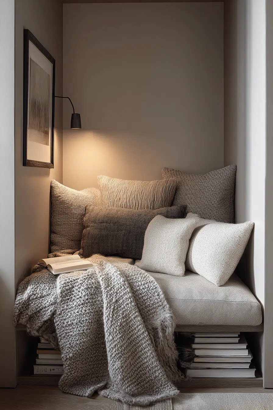 Muted tones and layered softness create a cocoon-like environment that feels calm and safe. Gentle colors enhance small reading nook cozy corner styling by promoting relaxation. Compact layouts ensure efficient use of space. Soft lighting adds warmth and depth. Minimal decor keeps everything balanced. The mood feels tranquil and cozy. Create a soothing reading sanctuary.
