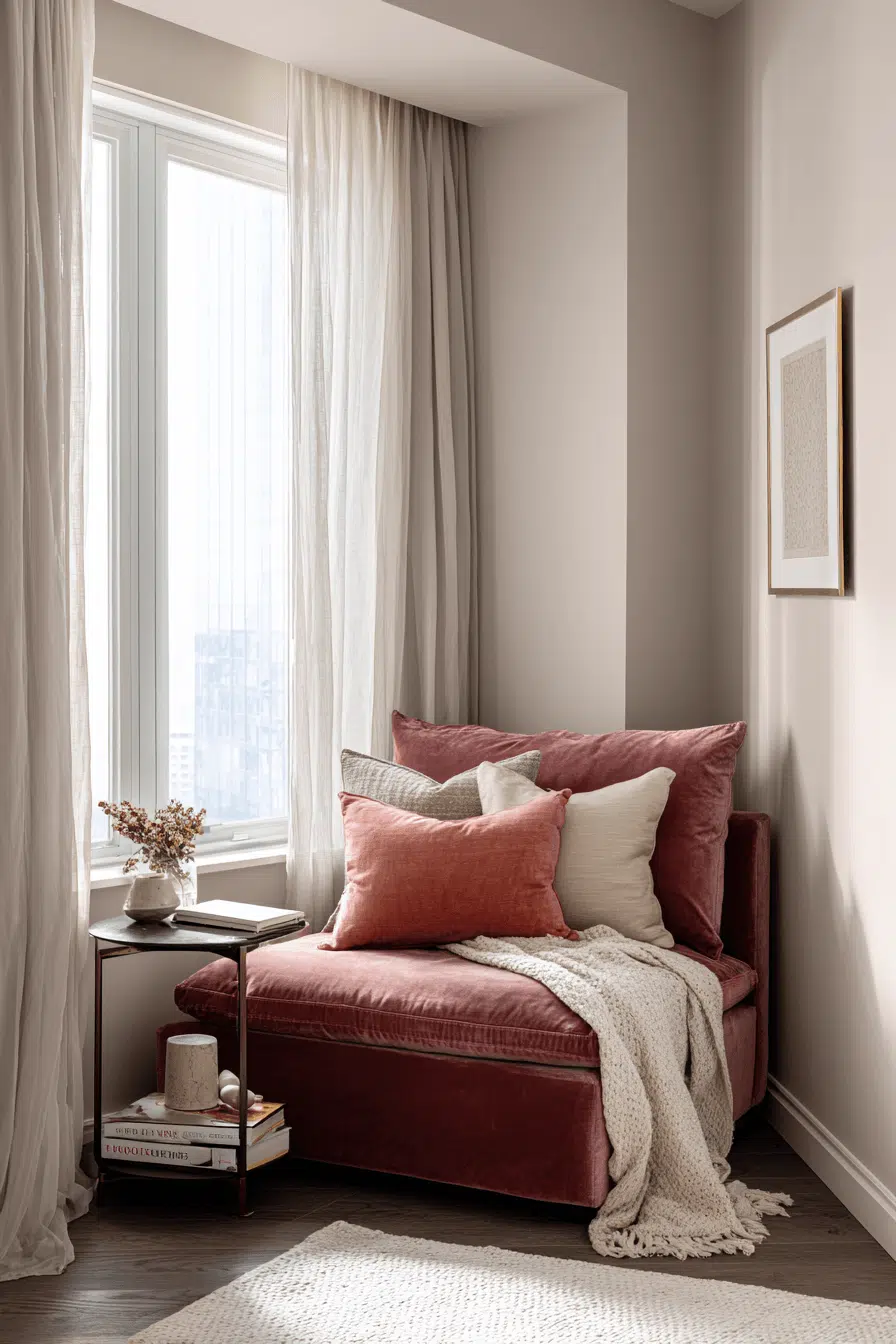 Soft velvet seating paired with natural light creates a luxurious yet inviting hideaway that feels instantly comforting. Layered cushions enhance small reading nook cozy corner styling by adding depth while keeping the layout breathable. Light diffuses gently across plush textures, creating warmth without heaviness. A slim side table keeps essentials within reach without cluttering the space. Subtle accents balance elegance with function. The mood feels rich, calm, and indulgent. Design your own velvet-inspired escape today.