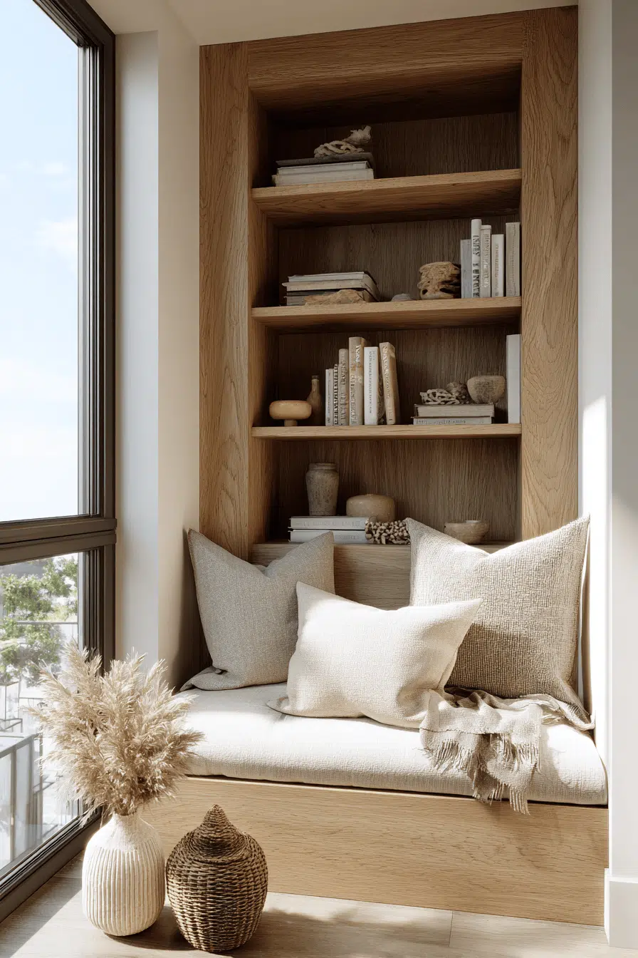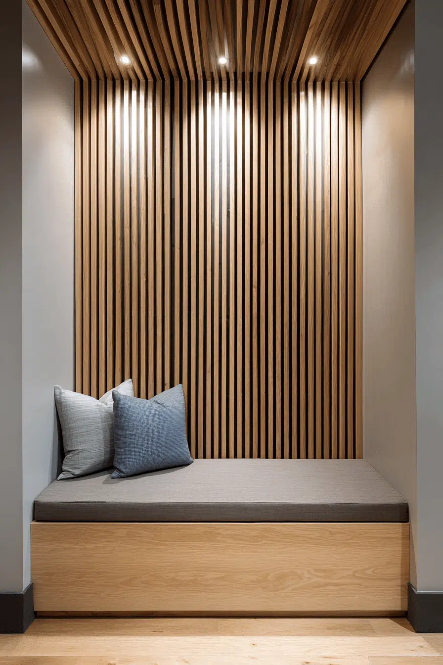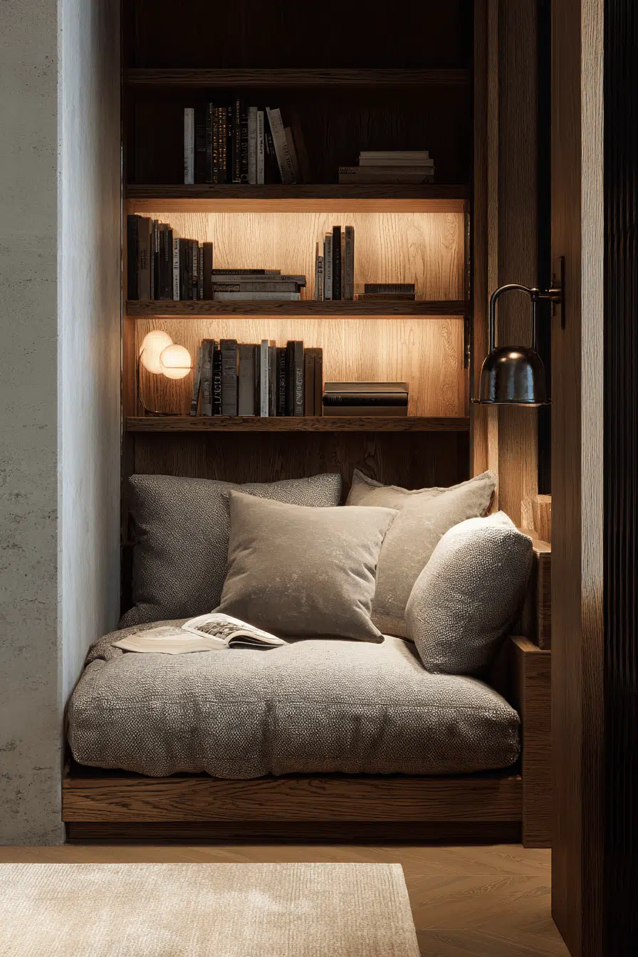 Wood slats introduce structure and texture while maintaining a natural, calming feel. Vertical lines enhance small reading nook cozy corner layouts by adding height and depth. Soft seating balances the design. Warm lighting highlights the material beautifully. Minimal decor keeps everything refined. The mood feels grounded and modern. Add architectural warmth to your nook.