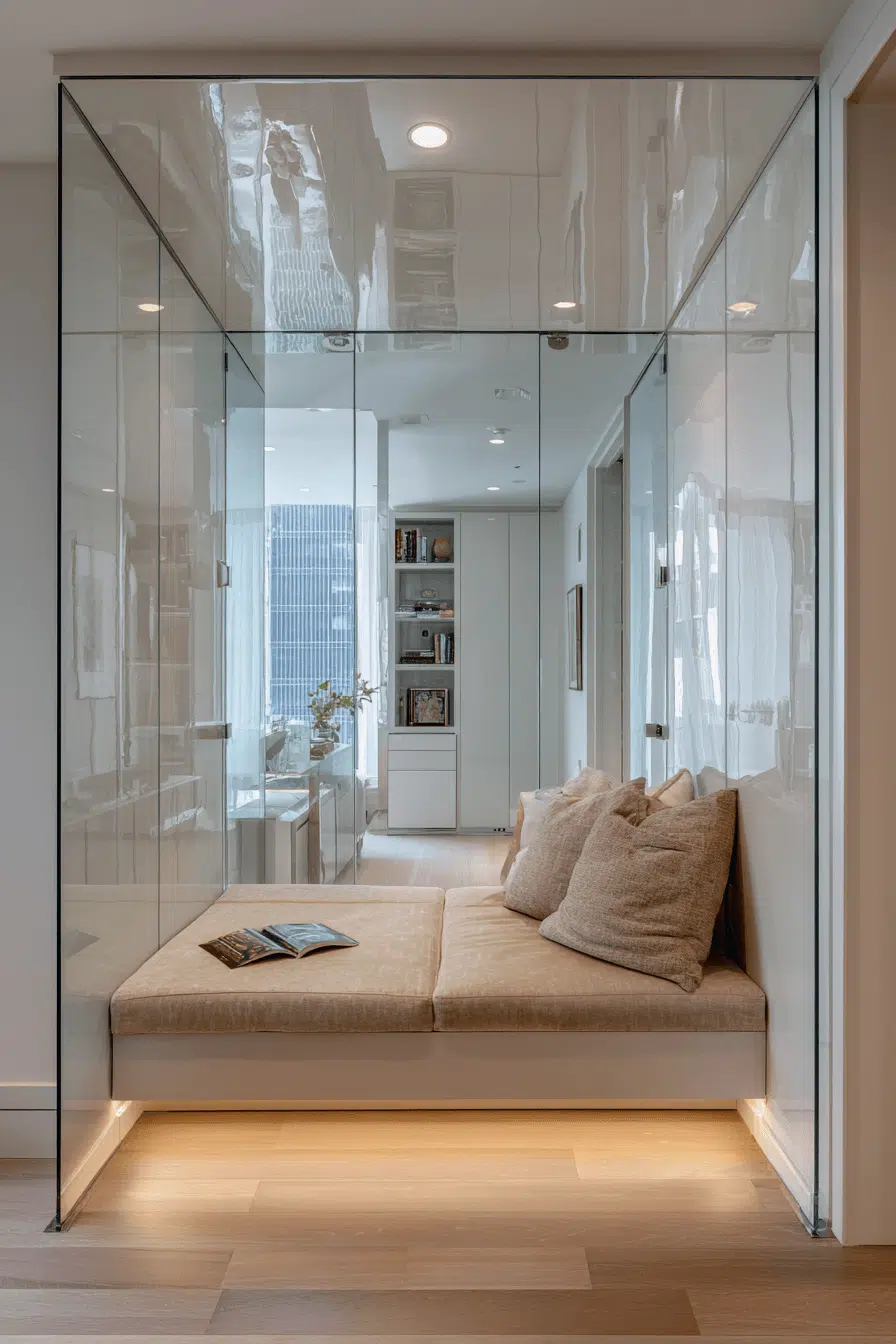 Reflective surfaces open up the space and bring in additional brightness, making compact areas feel larger. Transparency enhances small reading nook cozy corner designs by reducing visual weight. Soft seating balances sleek elements. Minimal styling keeps the look refined. Subtle accents maintain functionality. The space feels light and modern. Brighten your nook with reflective design.