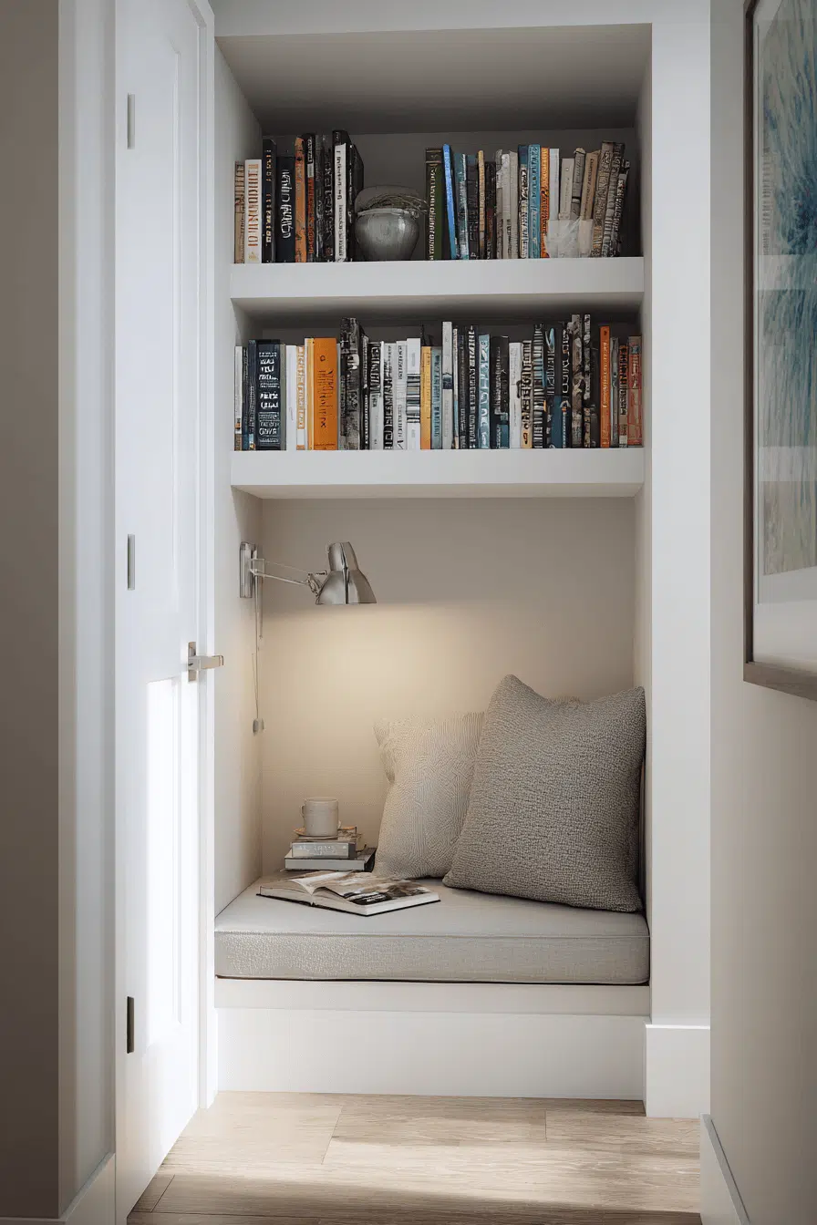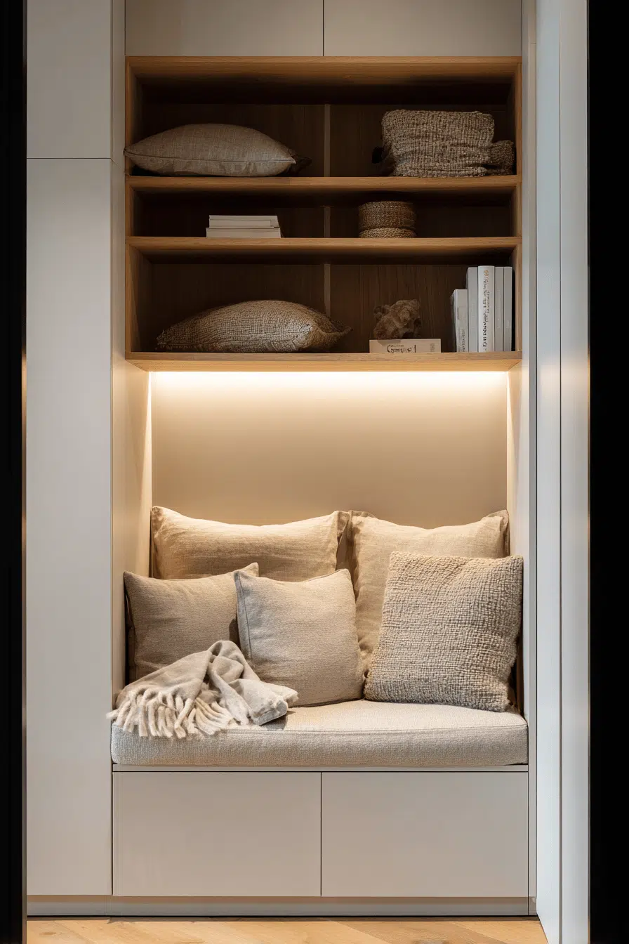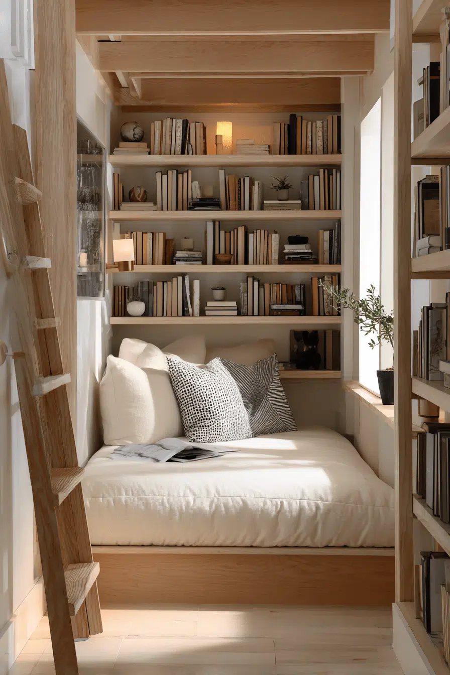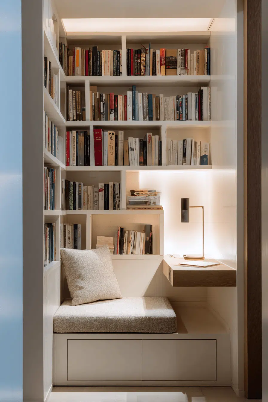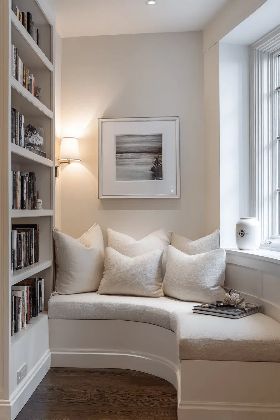 Built-in shelving transforms the nook into a functional mini library filled with personality. Books enhance small reading nook cozy corner designs by adding color and depth. Compact seating keeps the layout efficient. Clean lines maintain structure. Subtle accents enhance warmth. The mood feels organized and inviting. Create your own library-style nook.