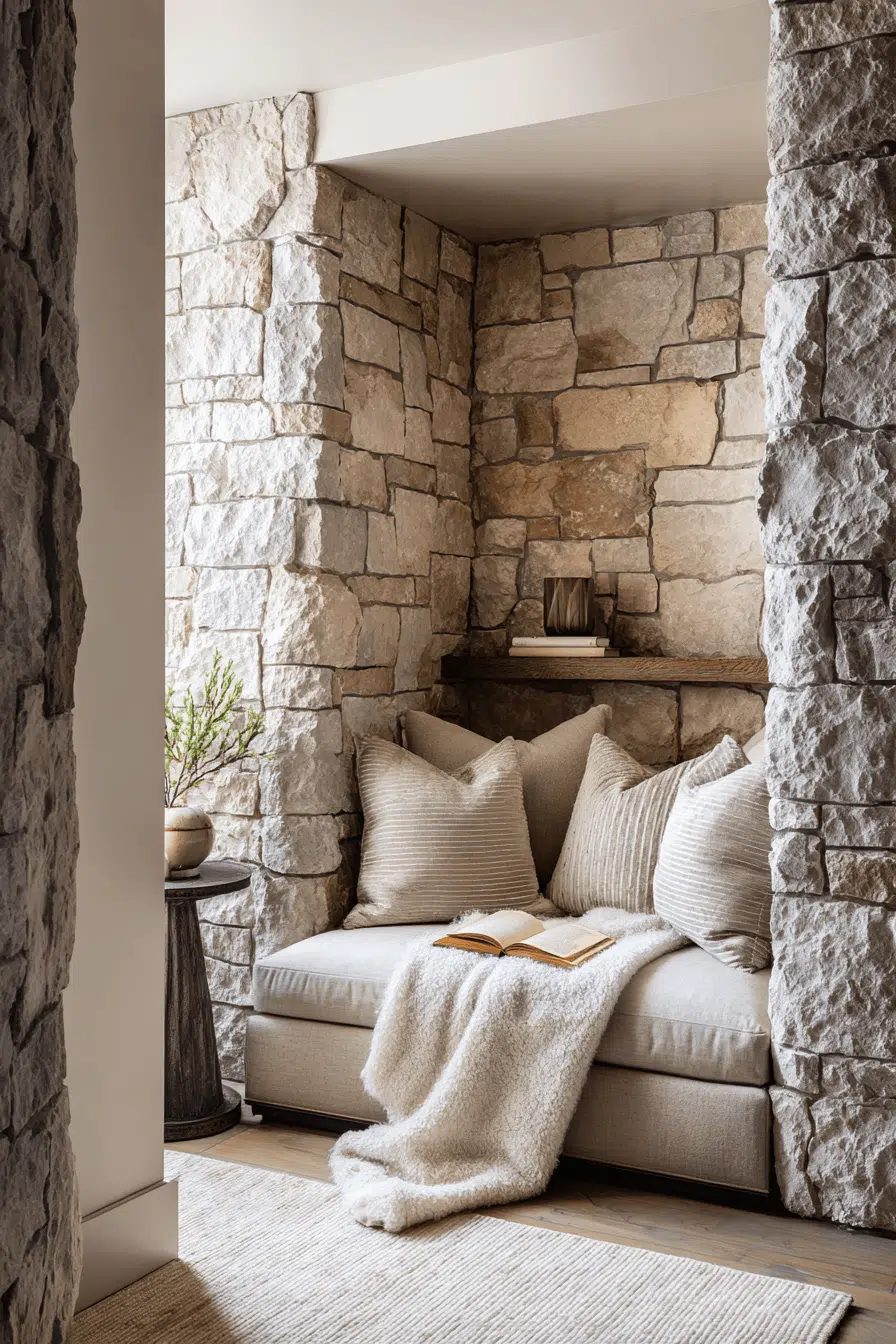 Stone finishes add subtle texture and depth while maintaining a cozy atmosphere. Balanced materials enhance small reading nook cozy corner designs by blending rugged and soft elements. Warm lighting highlights the natural surface. Neutral tones keep everything cohesive. Soft textiles complete the layered look. The mood feels grounded and inviting. Introduce natural texture into your nook.