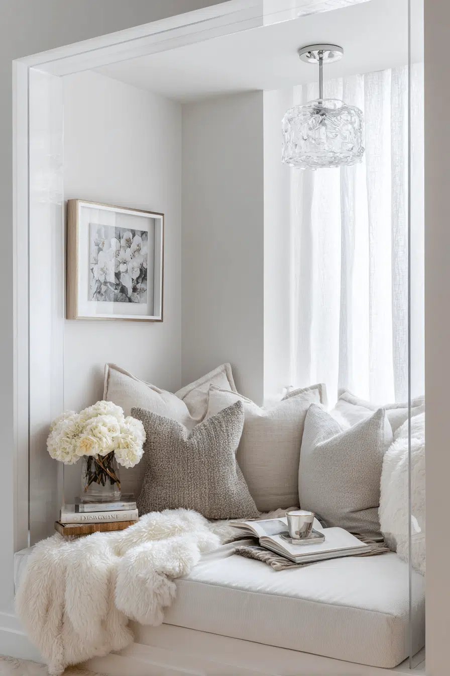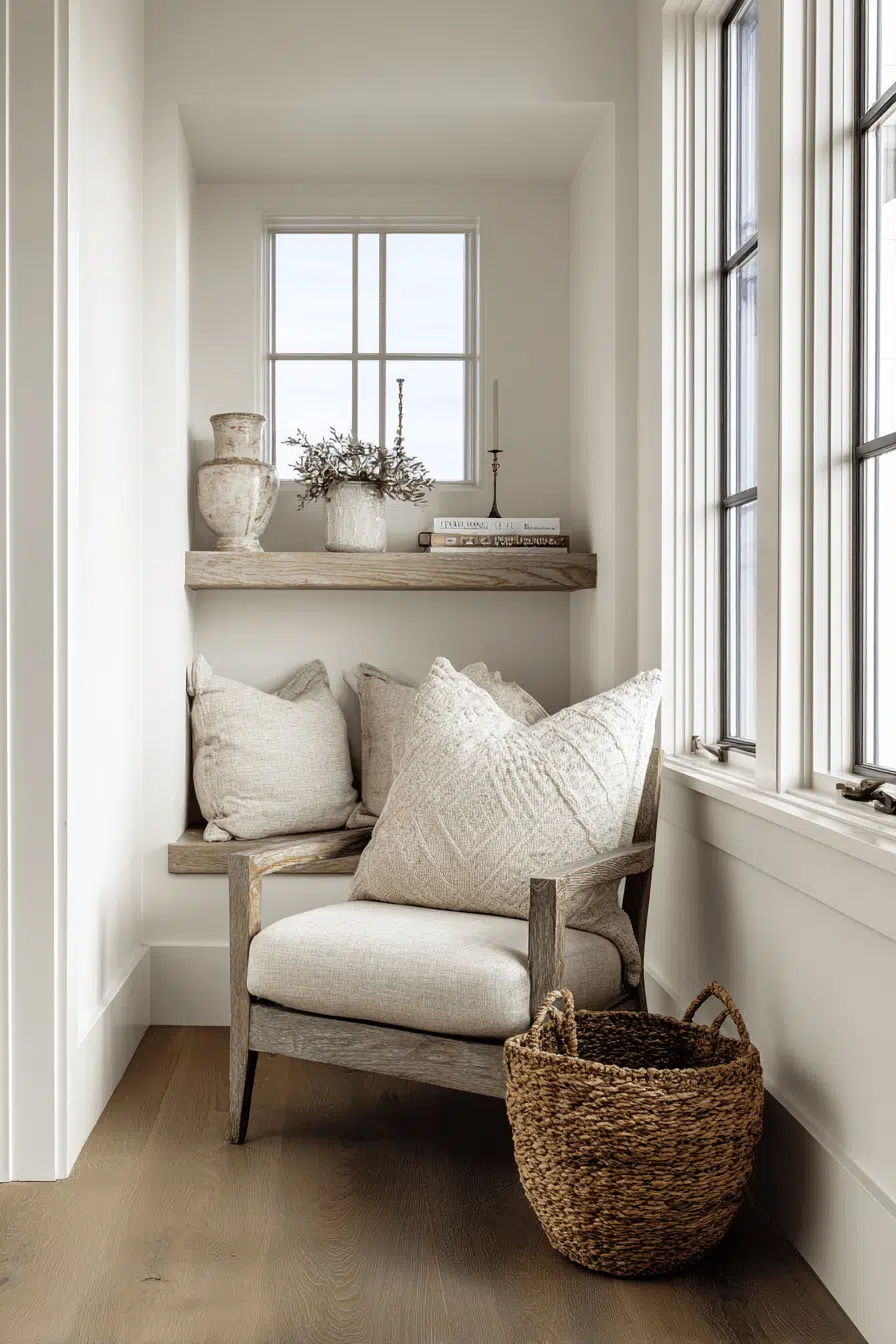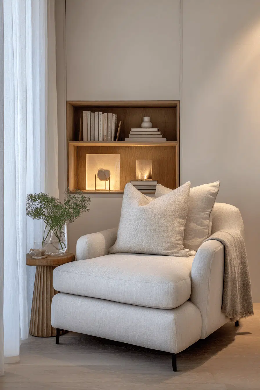 Light linen fabrics and soft tones create a peaceful and breathable reading space. Neutral palettes enhance small reading nook cozy corner styling by promoting calm and visual clarity. Clean lines keep everything open and uncluttered. Minimal decor allows comfort to take center stage. Gentle lighting adds warmth without distraction. The mood feels serene and refreshing. Refresh your nook with soft linen simplicity.