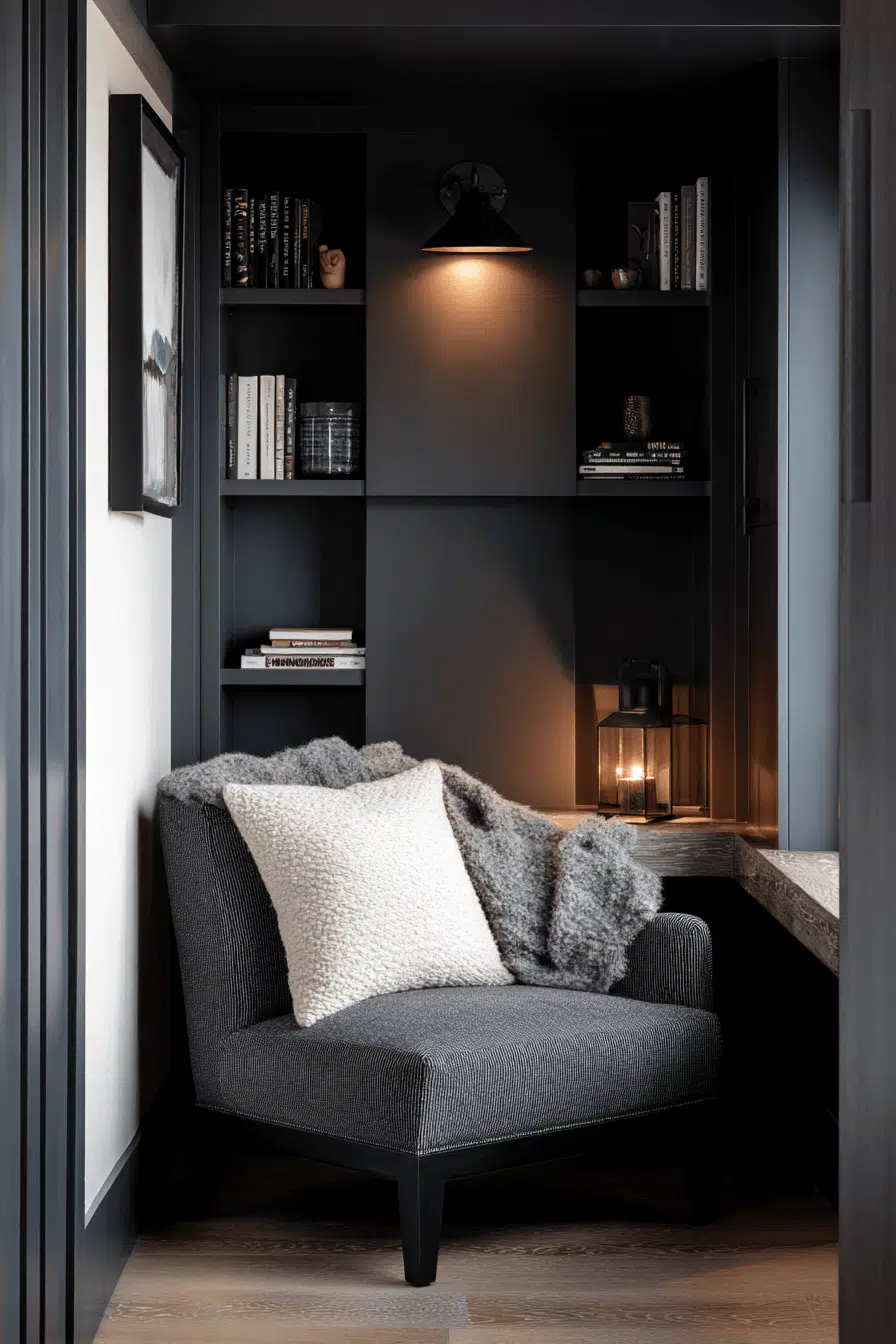 Dark tones introduce contrast and depth, creating a cozy and intimate reading spot. Bold finishes enhance small reading nook cozy corner designs by defining the space clearly. Warm lighting balances the darker palette. Soft textures add comfort. Clean lines maintain structure. The mood feels stylish and focused. Add dramatic contrast to your nook.