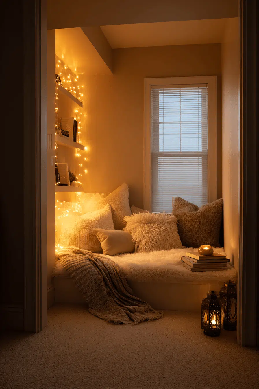 Warm lighting creates a soft glow that enhances comfort and relaxation throughout the space. Layered illumination enhances small reading nook cozy corner setups by adding depth and mood. Plush fabrics complement the lighting beautifully. Compact seating keeps everything efficient. Minimal styling maintains balance. The mood feels dreamy and inviting. Create a glow-filled reading retreat.
