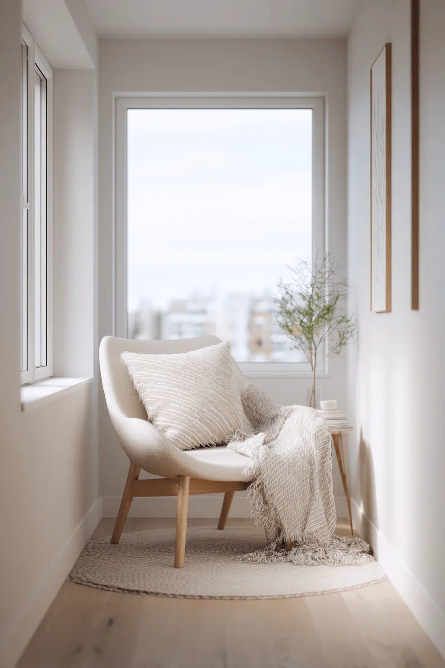 Pale woods and airy fabrics create a bright, calming setup that feels effortlessly open. Clean styling enhances small reading nook cozy corner layouts by keeping everything uncluttered and easy to enjoy. Light tones reflect natural brightness, expanding even the smallest spaces visually. A simple seat with a soft throw keeps things cozy without excess. Minimal decor maintains balance. The atmosphere feels fresh and uplifting. Bring this Nordic-inspired calm into your corner.