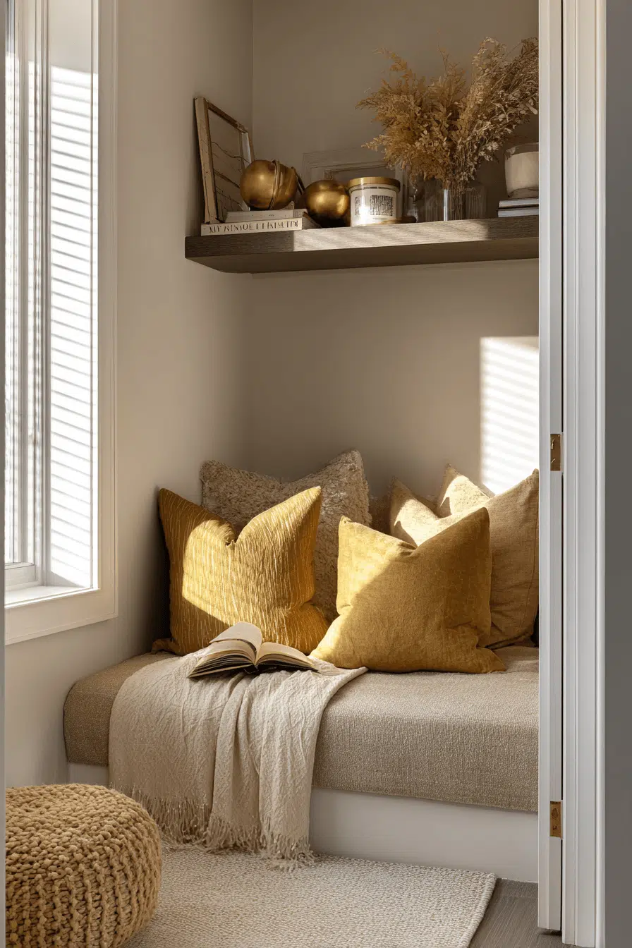 Golden tones create a warm and uplifting environment inspired by soft natural light. Warm hues enhance small reading nook cozy corner designs by reflecting brightness and comfort. Layered textiles add depth. Compact layouts ensure functionality. Subtle accents enhance the glow. The mood feels cozy and energizing. Capture warm light in your nook.