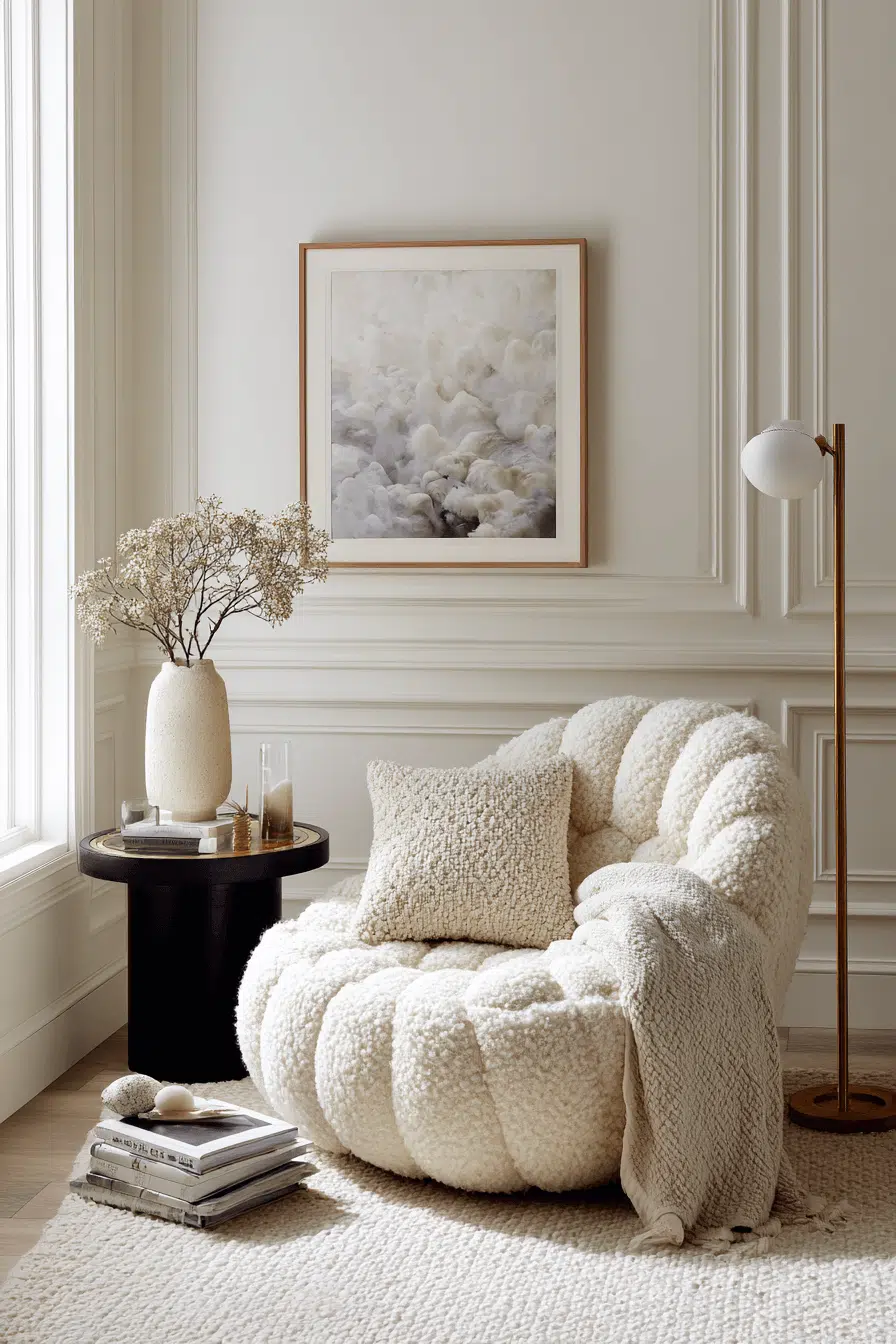 Bouclé textures introduce softness and modern charm into compact reading spaces. Plush fabrics enhance small reading nook cozy corner styling by adding tactile interest. Neutral tones keep everything cohesive. Minimal decor allows texture to stand out. Soft lighting enhances comfort. The mood feels chic and cozy. Indulge in bouclé comfort.