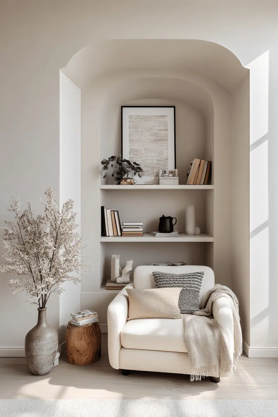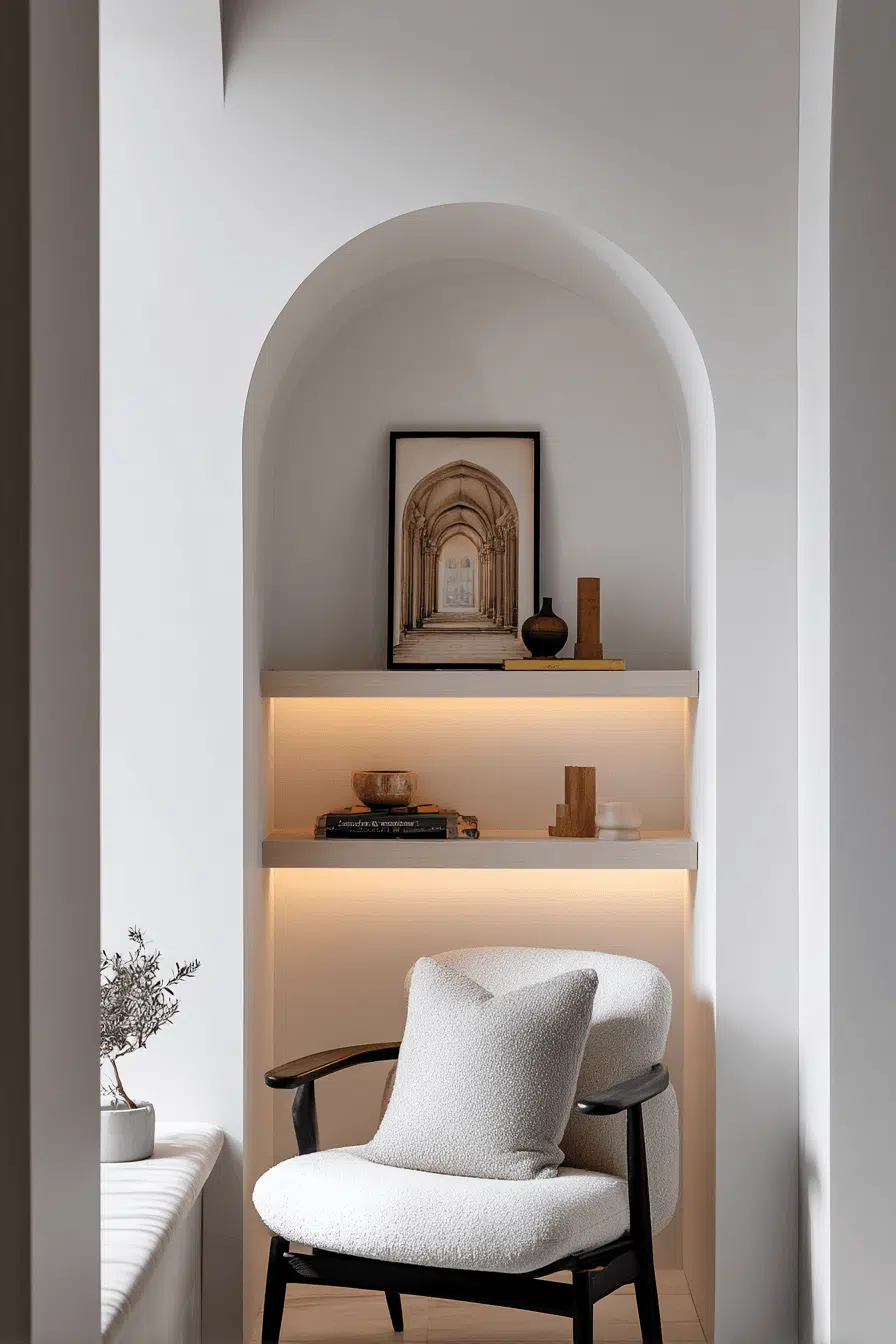 Curved architectural details frame the space beautifully, adding elegance and softness. Gentle lighting enhances small reading nook cozy corner setups by highlighting structure and depth. A simple seat keeps the focus on comfort. Minimal styling maintains balance. Subtle accents add refinement. The mood feels intimate and thoughtfully designed. Add a soft architectural touch to your nook.