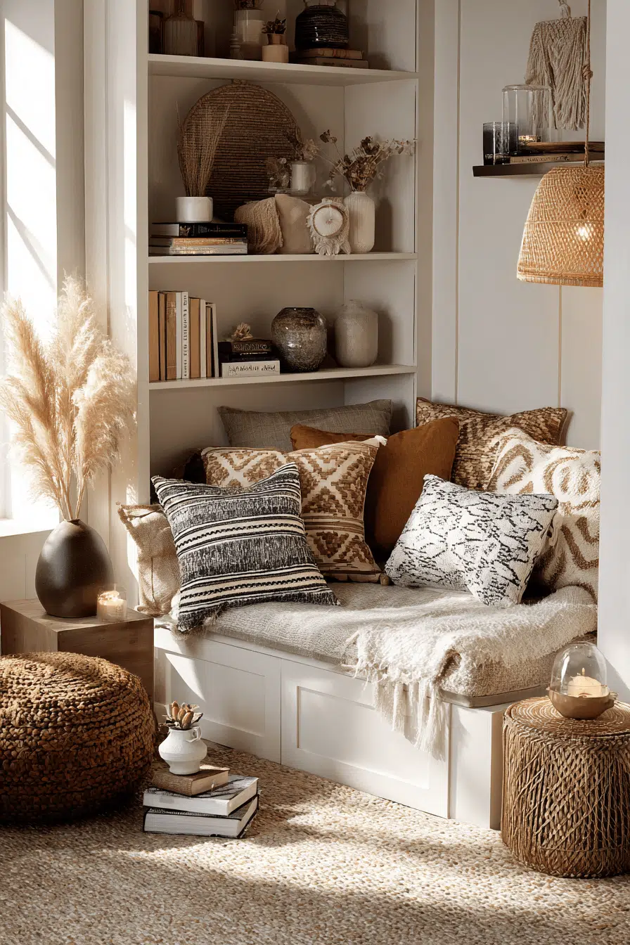 Layered patterns and woven materials introduce warmth and personality into compact spaces. Natural textures enhance small reading nook cozy corner designs by creating a relaxed, inviting feel. A low-profile seat keeps everything functional and comfortable. Balanced colors prevent visual overwhelm. Soft lighting enhances the cozy atmosphere. The mood feels creative and laid-back. Add a touch of boho warmth to your nook.