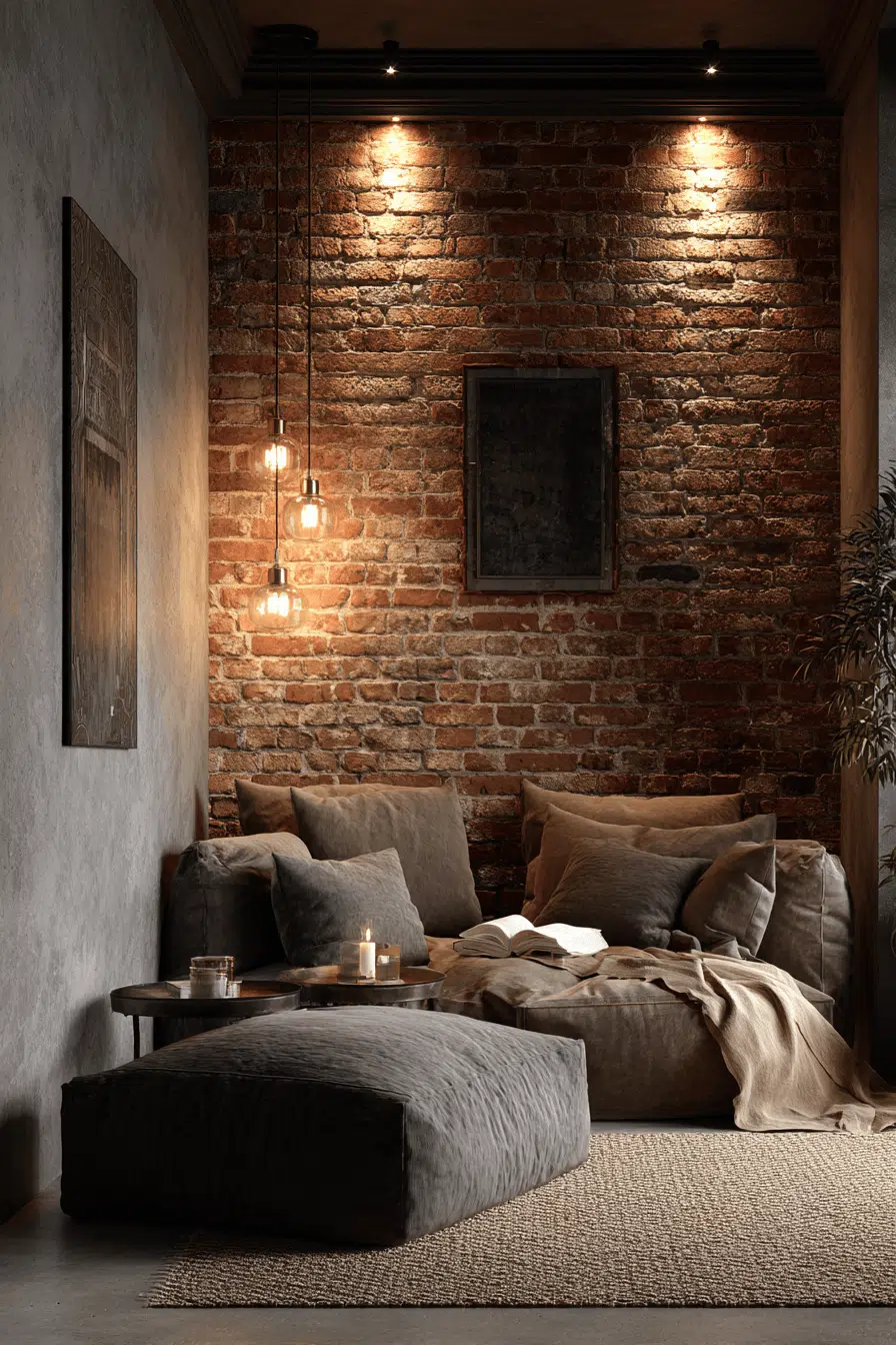 Exposed textures bring depth and character while maintaining a cozy, inviting feel. Soft seating enhances small reading nook cozy corner designs by balancing rugged elements with comfort. Warm lighting highlights texture beautifully. Neutral tones soften the overall look. Compact design ensures practicality. The atmosphere feels grounded and stylish. Create a warm urban-inspired retreat.