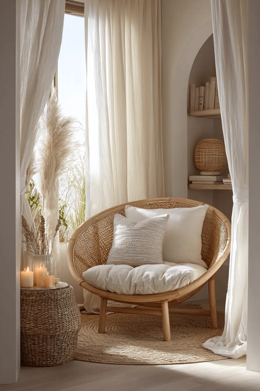 Natural woven materials and soft fabrics create a relaxed, airy atmosphere that feels easy and comfortable. Light textures enhance small reading nook cozy corner styling by keeping the space breathable. A compact chair maintains functionality without clutter. Soft accents add subtle warmth. Neutral tones maintain cohesion. The mood feels calm and refreshing. Bring breezy comfort into your reading corner.