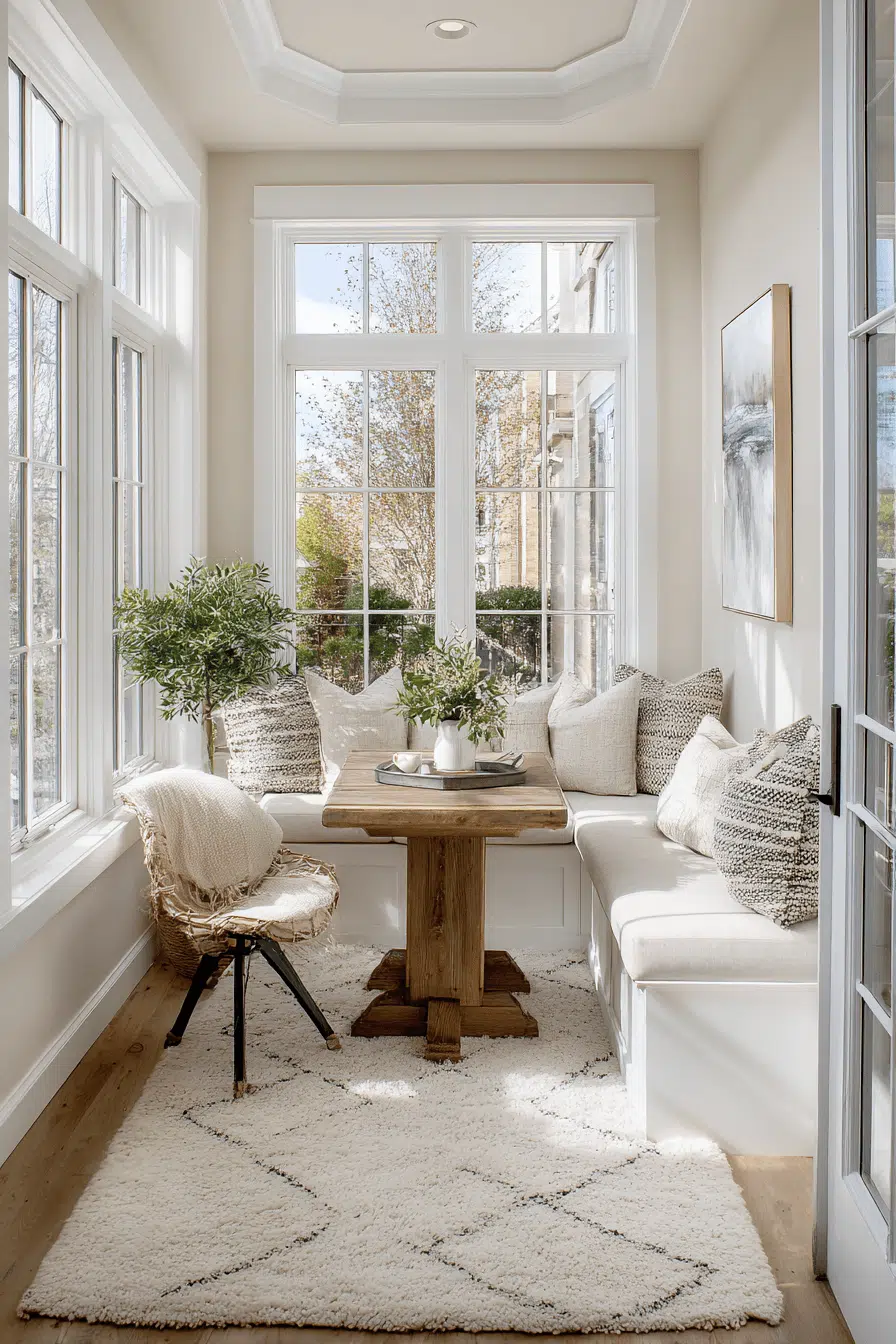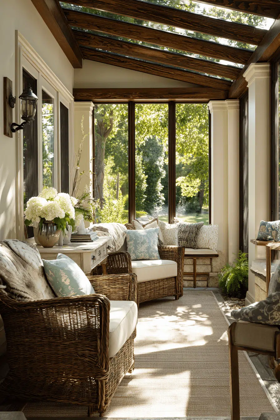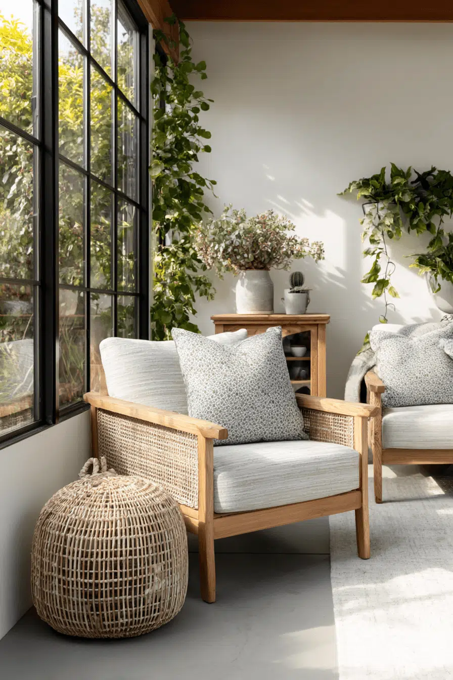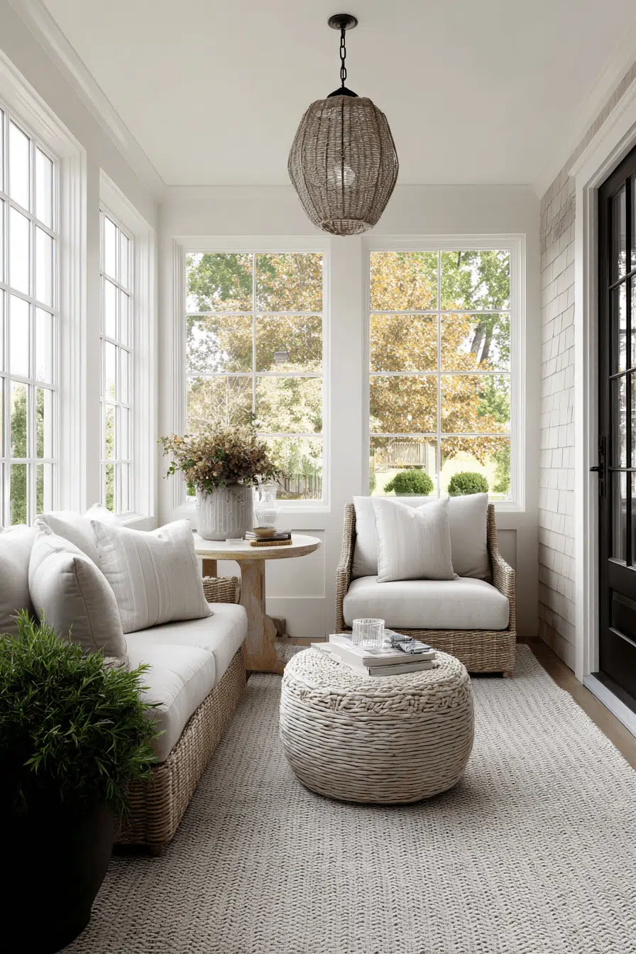 Soft textures and natural light create a soothing small sunroom escape filled with calm energy. Wood tones and woven details add warmth and cohesion. Sunlight highlights every surface beautifully. The space feels grounded yet bright. Minimal styling maintains serenity. The mood feels tranquil and stylish. Create your own oasis.