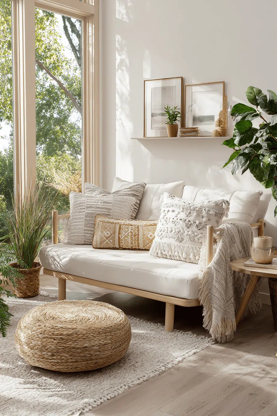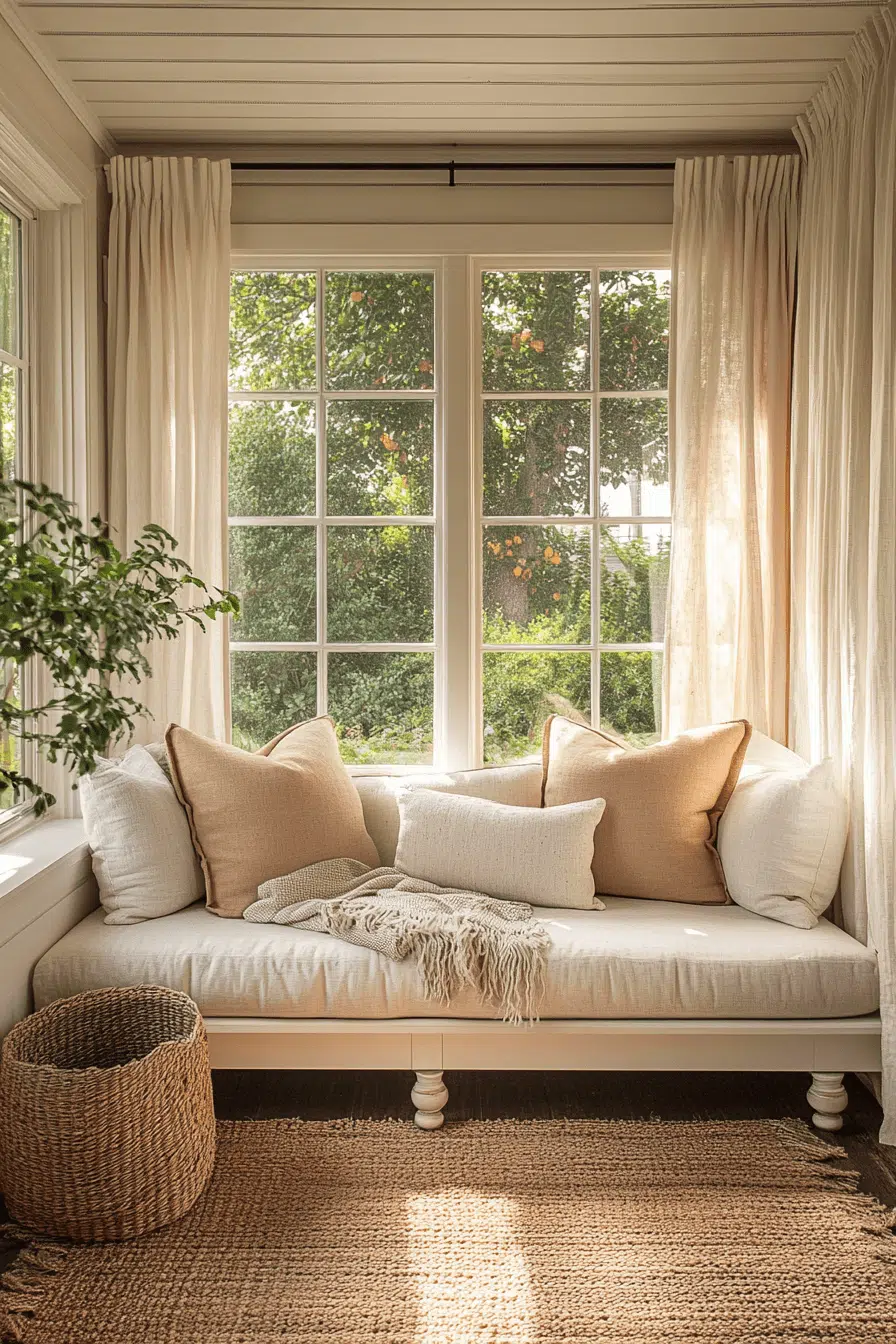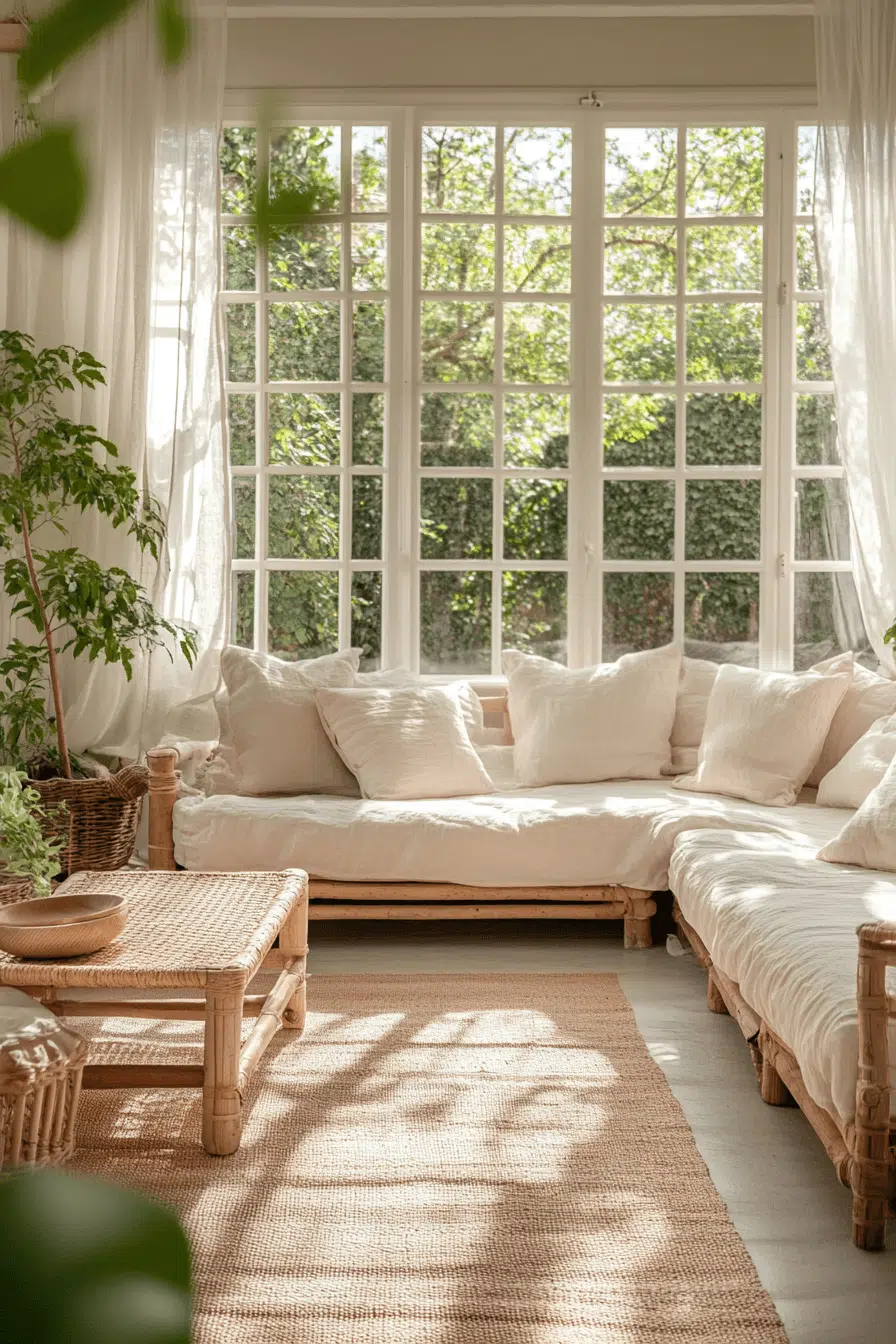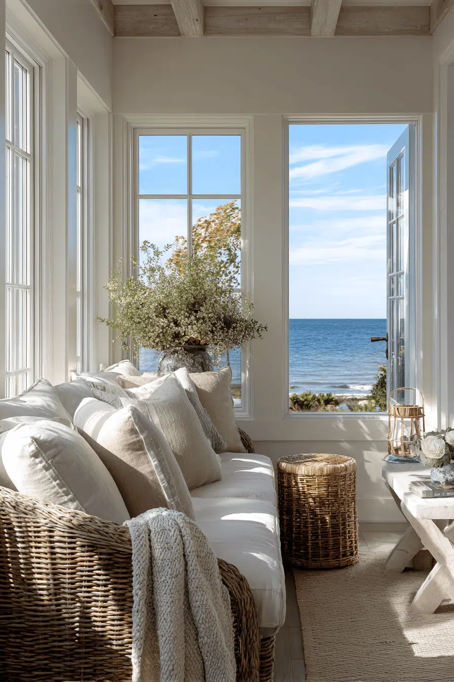 Soft textures and natural light create a soothing small sunroom escape filled with calm energy. Wood tones and woven details add warmth and cohesion. Sunlight highlights every surface beautifully. The space feels grounded yet bright. Minimal styling maintains serenity. The mood feels tranquil and stylish. Create your own oasis.
