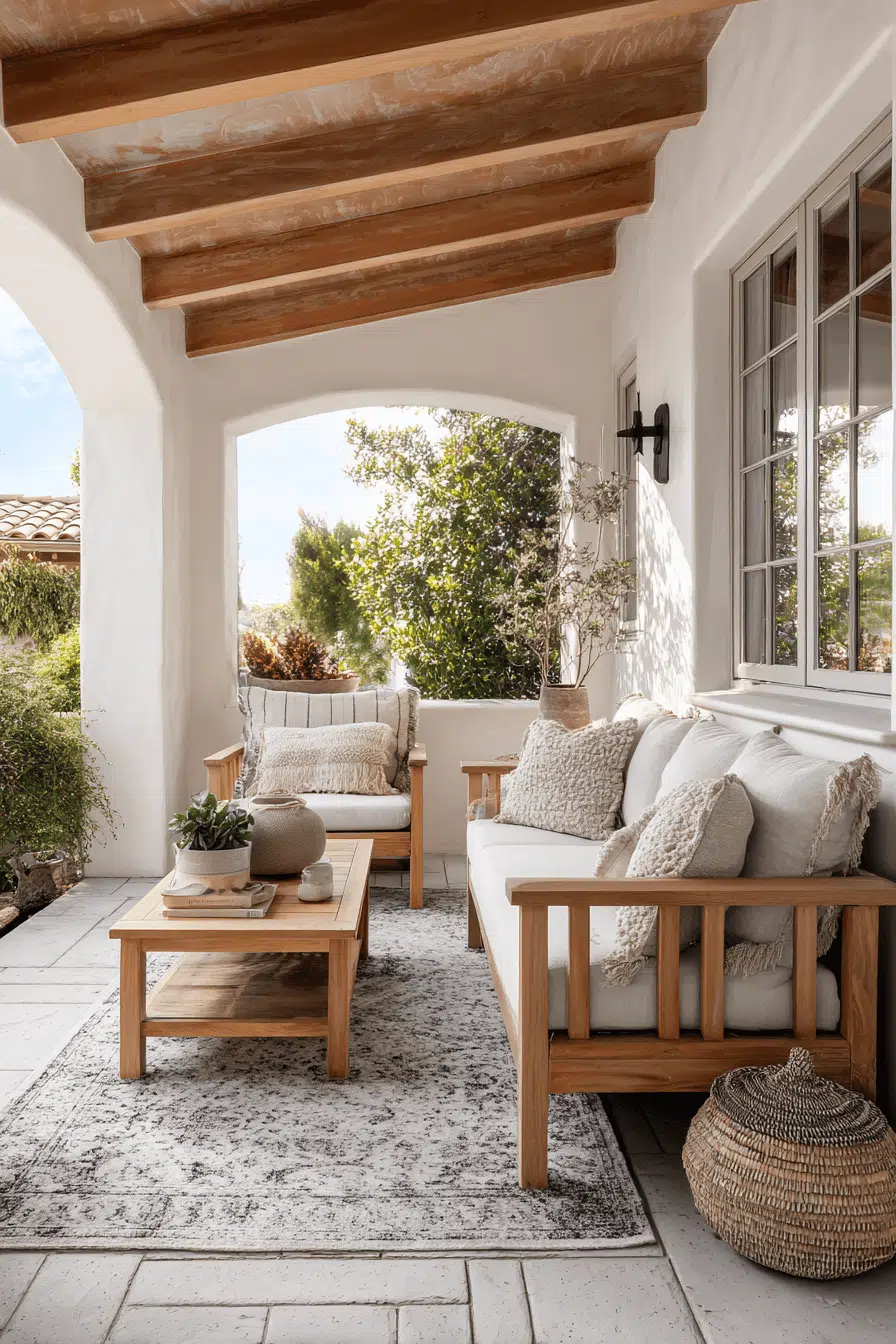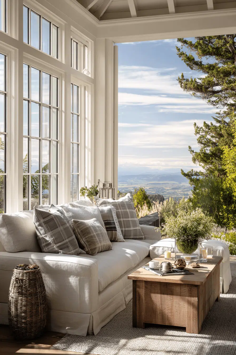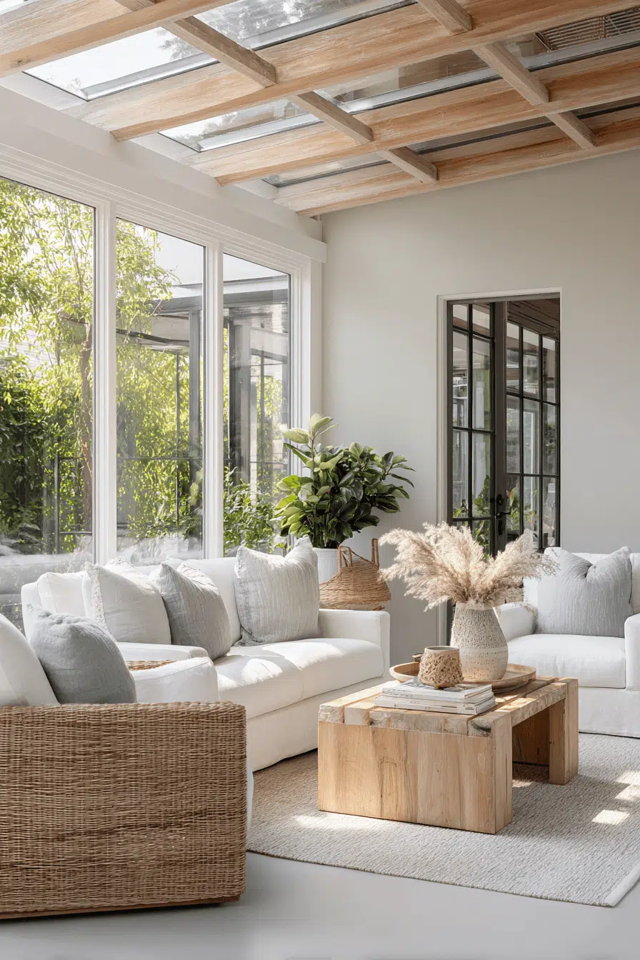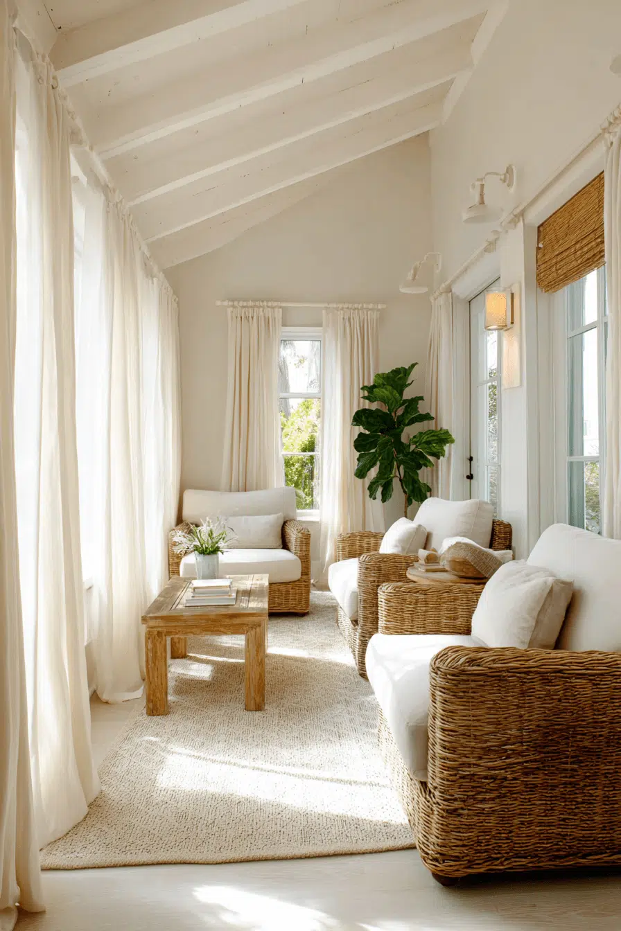Open, terrace-inspired styling creates a breezy and bright small sunroom that feels effortlessly connected to the outdoors. Sheer fabrics and pale finishes maintain a light, airy aesthetic. Sunlight flows freely through the space, enhancing every surface. The layout stays simple for easy movement and relaxation. Minimal accents keep everything cohesive. The space feels open and refreshing. Bring this airy design into your home.