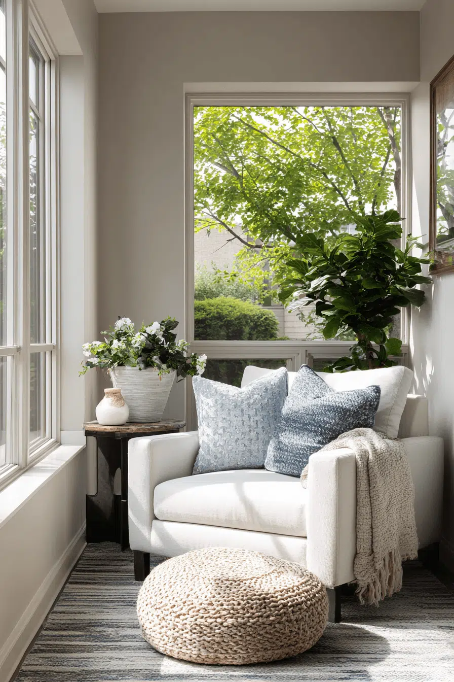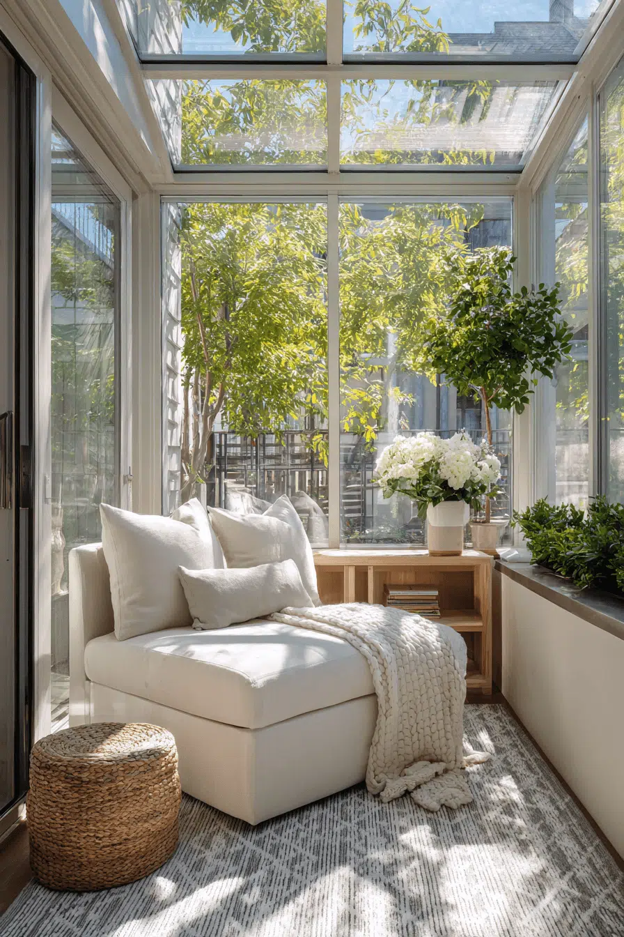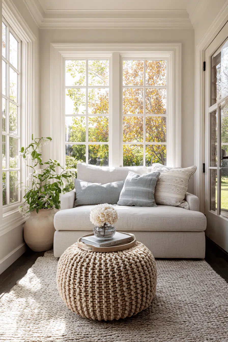 A cozy styled nook transforms this small sunroom into a comfortable and inviting space. Soft seating and clean finishes create a polished look. Natural light enhances every detail. The layout is compact but functional. Subtle accents add personality. The mood feels cozy and uplifting. Explore this styled nook.