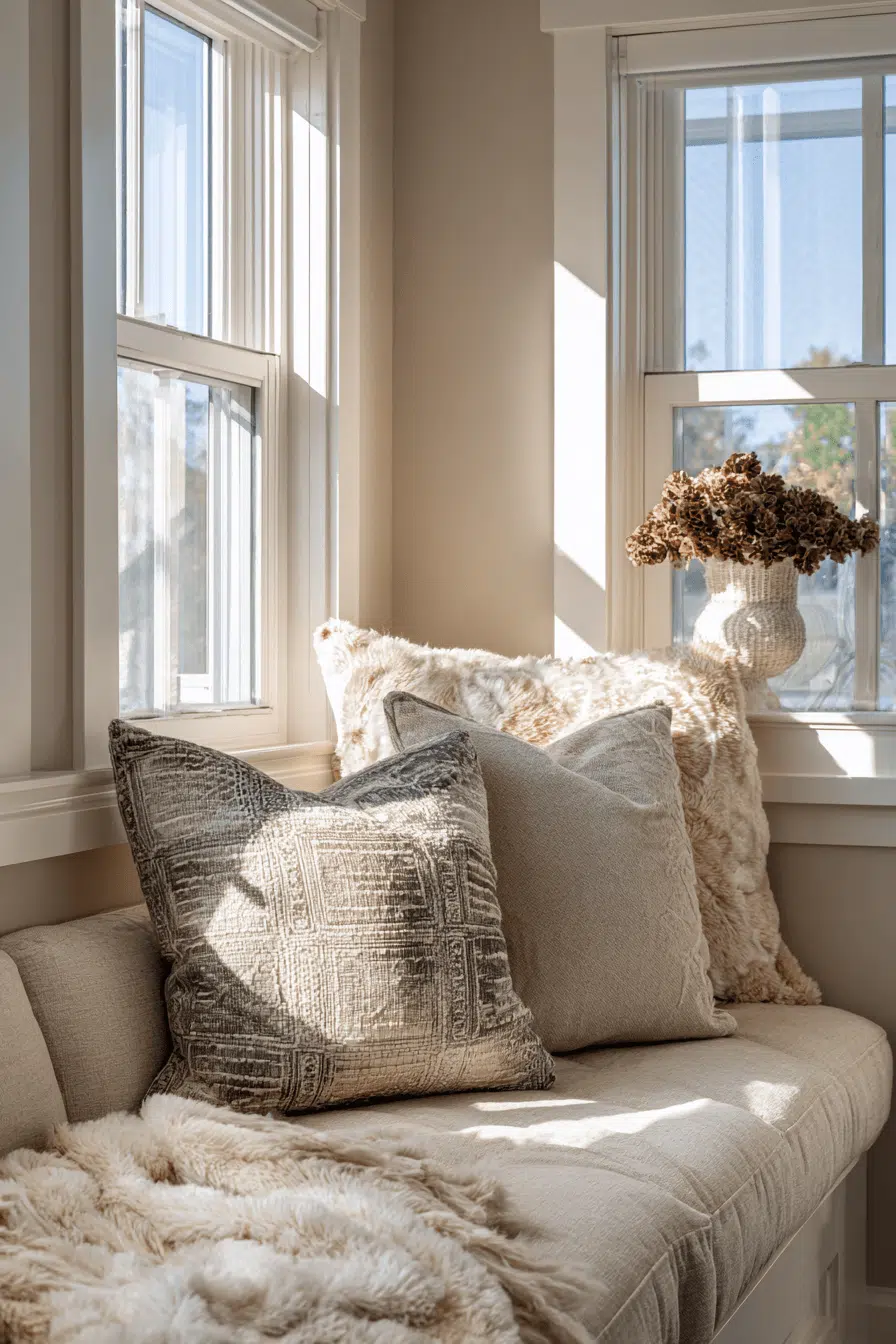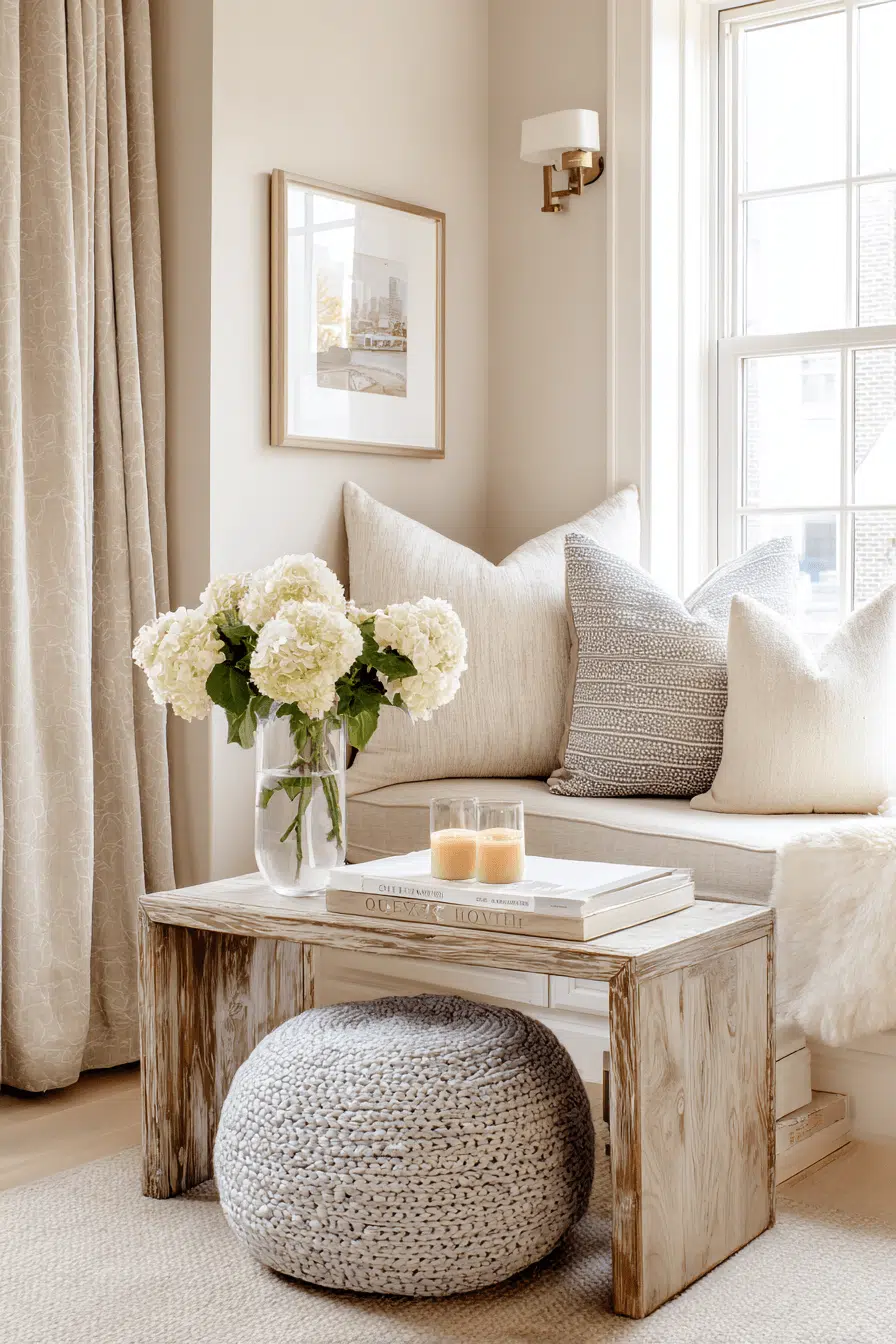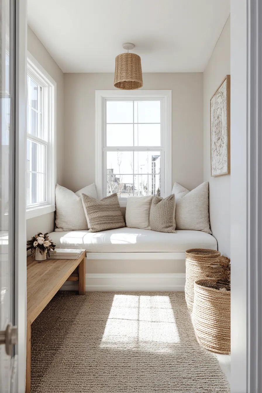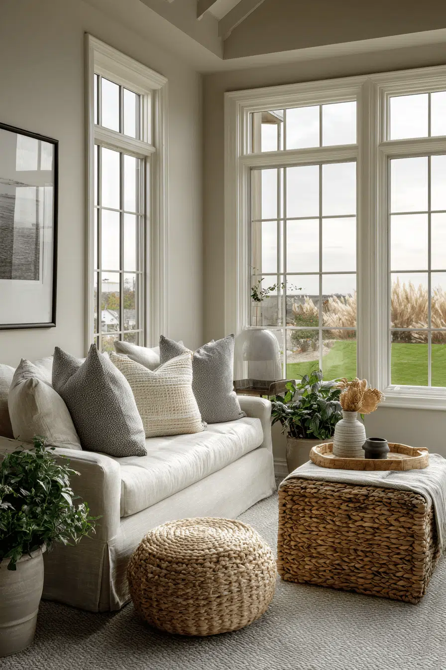 A cozy styled nook transforms this small sunroom into a comfortable and inviting space. Soft seating and clean finishes create a polished look. Natural light enhances every detail. The layout is compact but functional. Subtle accents add personality. The mood feels cozy and uplifting. Explore this styled nook.