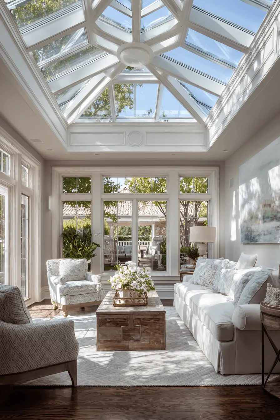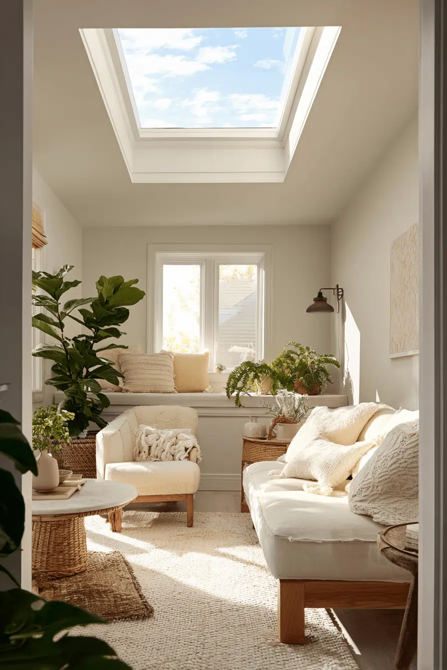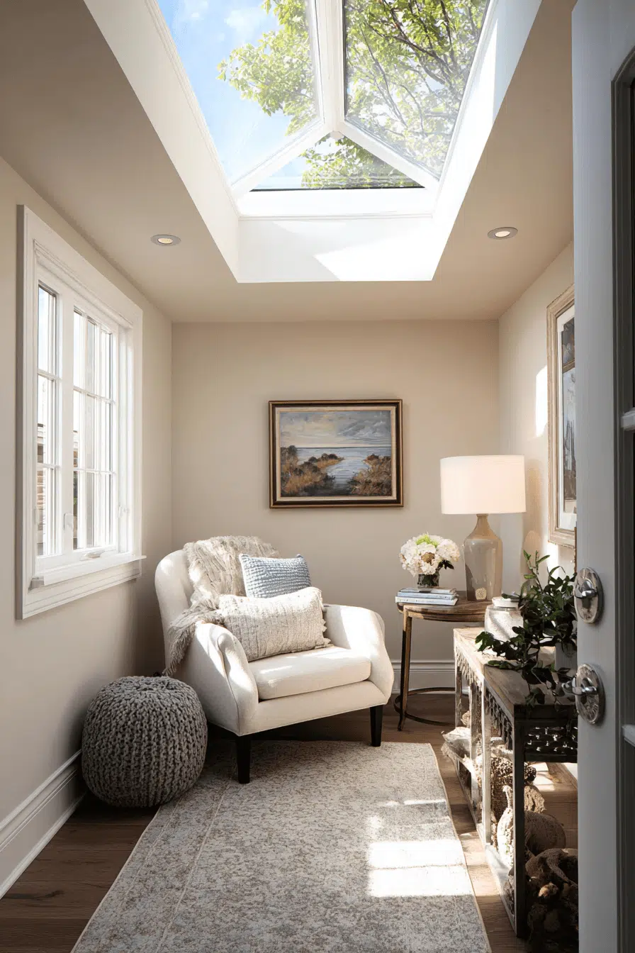 Skylight illumination creates a cozy and glowing small sunroom filled with soft brightness. Light fabrics and warm textures enhance comfort. Overhead light adds gentle dimension. The layout feels open and inviting. Minimal decor keeps balance. The mood feels calm and restful. Experience this skylight design.