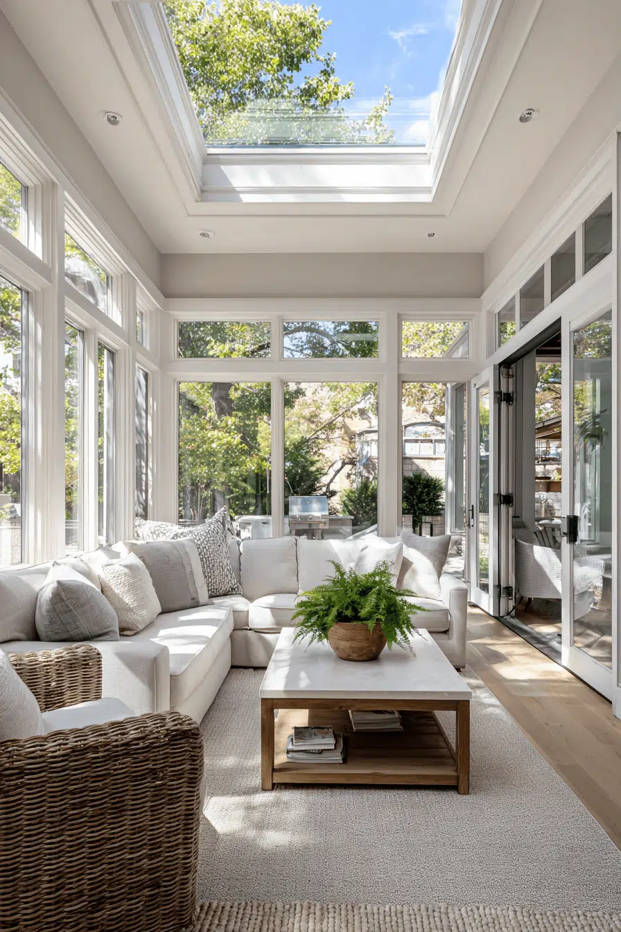 Indoor and outdoor elements blend seamlessly in this inviting small sunroom extension. Comfortable seating and light textures create a welcoming feel. Sunlight flows freely through the open design. The layout remains functional and easy to navigate. Minimal accents keep everything grounded. The mood feels fresh and relaxed. Explore this seamless design.