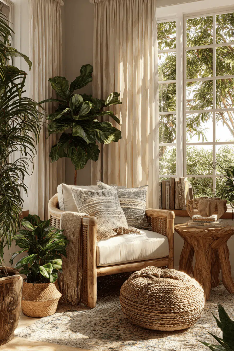 Vibrant greenery fills this small sunroom, creating a lively yet calming connection to nature. Soft curtains filter sunlight, casting a warm glow across organic textures. Materials like rattan, wood, and linen bring depth while staying light. Thoughtful plant placement adds life without crowding the layout. Every detail feels effortless and balanced. The mood feels fresh and inviting. Step into this natural oasis.