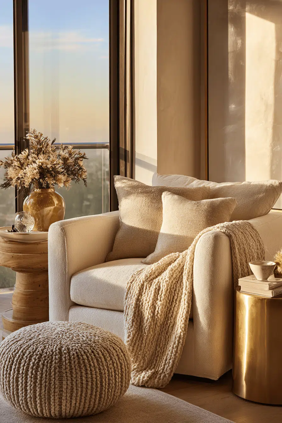 Golden sunlight enhances this small sunroom, creating a warm and glowing retreat filled with soft shadows. Cozy seating in neutral tones pairs beautifully with subtle wood accents. Light highlights every texture, adding dimension and richness. Clean lines keep the design polished and uncluttered. A simple throw adds comfort without excess. The mood feels warm and serene. Experience this golden glow.
