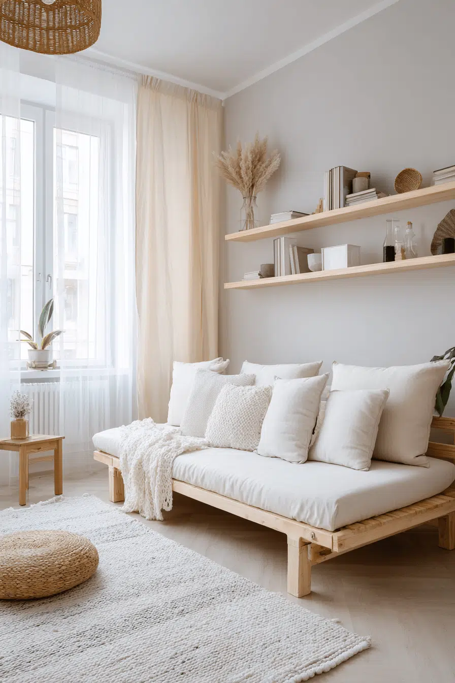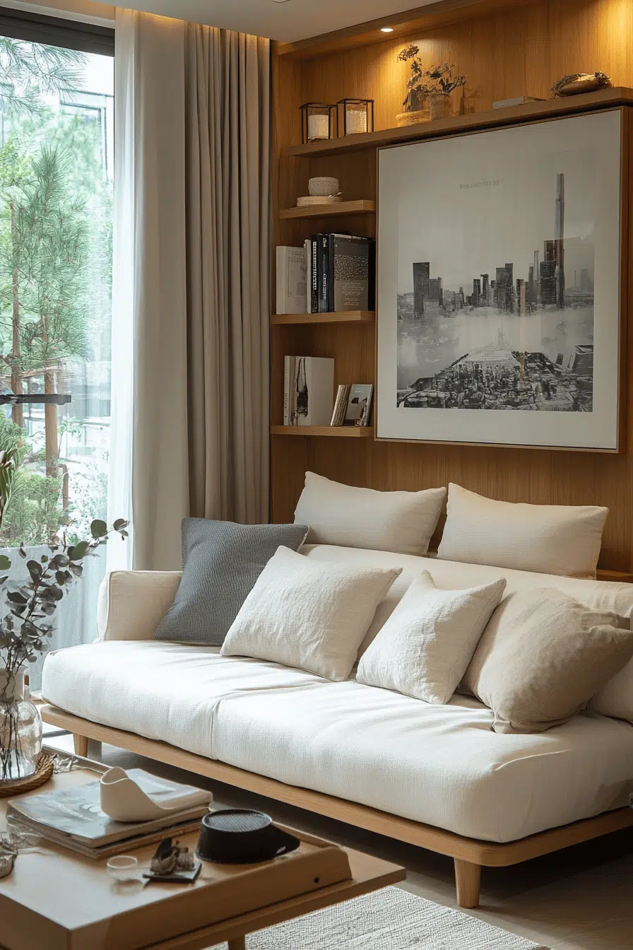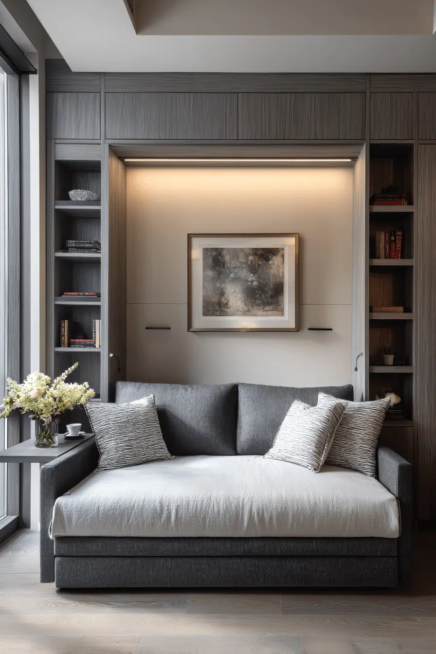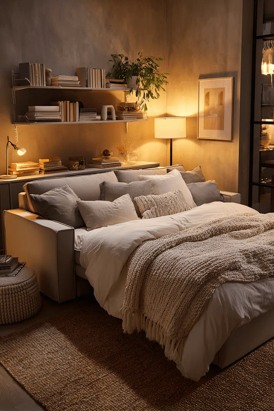 Open shelving paired with curated décor enhances a stylish sofa bed living room grounded in Elegant Living Room Design. Books and sculptural accents add personality. Balanced spacing keeps everything intentional. The sleeper remains central yet refined. Function and artistry coexist beautifully. Tap to style your shelves with purpose!