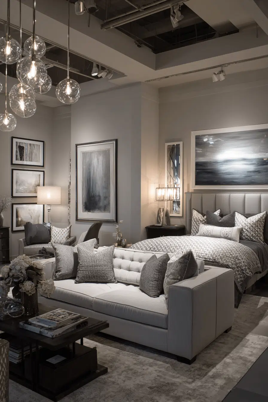 Subtle glam accents bring sparkle into your sofa bed living room without overwhelming Elegant Living Room Design. Brushed gold finishes and mirrored details add shimmer. Velvet upholstery enhances tactile richness. Coordinated bedding complements the palette. Luxury and practicality coexist beautifully. Click to add polished glamour!