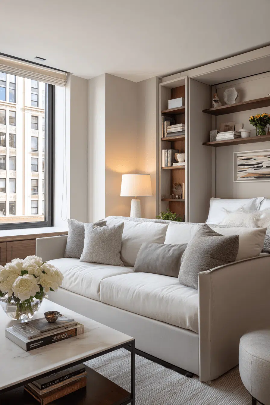 Compact yet curated styling keeps a small sofa bed living room aligned with Elegant Living Room Design. Slim armrests preserve openness. Vertical shelving adds storage without bulk. Thoughtful décor placement enhances balance. The sleeper transitions gracefully from day to night. Click to maximize your small-space impact!