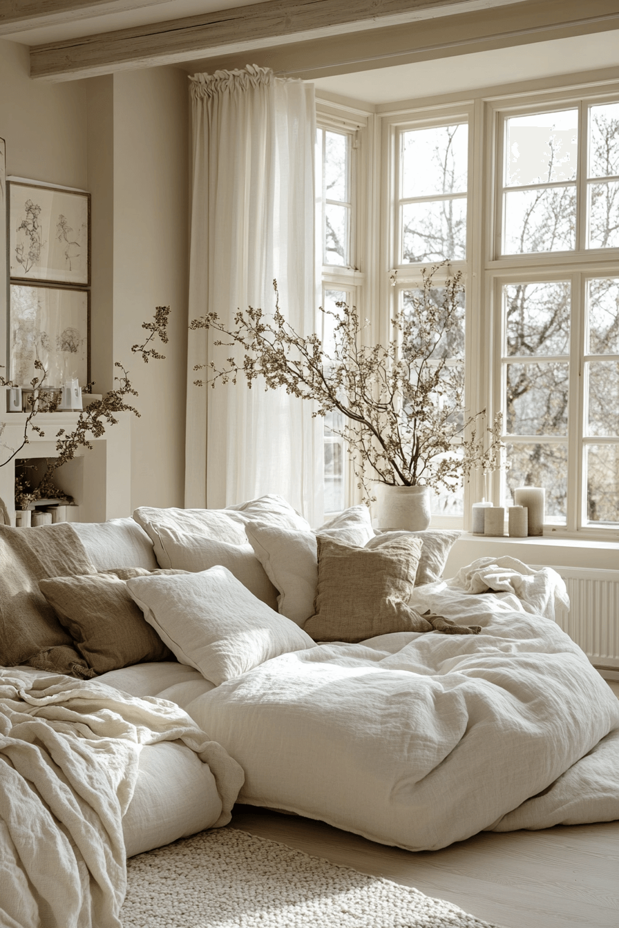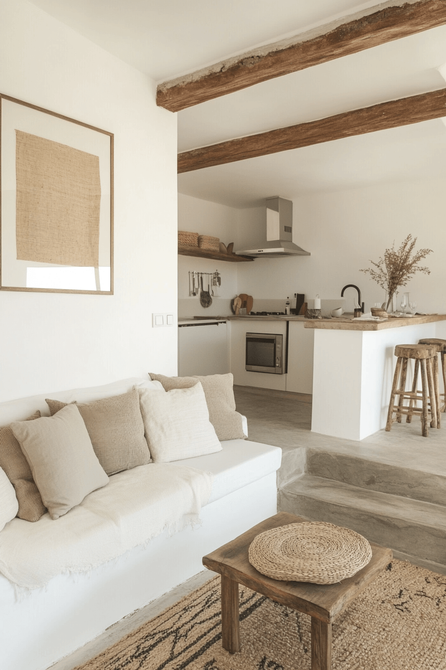 Light neutrals open up a small room while keeping it warm. Shades of cream, beige, and soft gray set a calm, welcoming tone. Layered textures add depth without clutter. Slim furniture makes the space breathe.