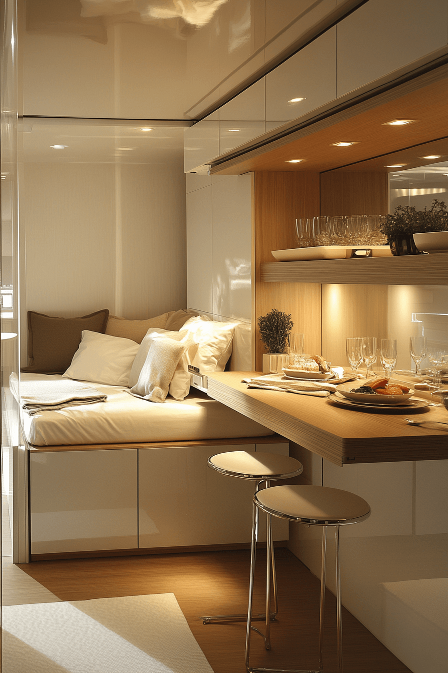 Refined compact living focuses on detail and quality. Smooth finishes, tailored furniture, and subtle metallics create elegance. Every inch is used wisely. The space feels polished and inviting.
