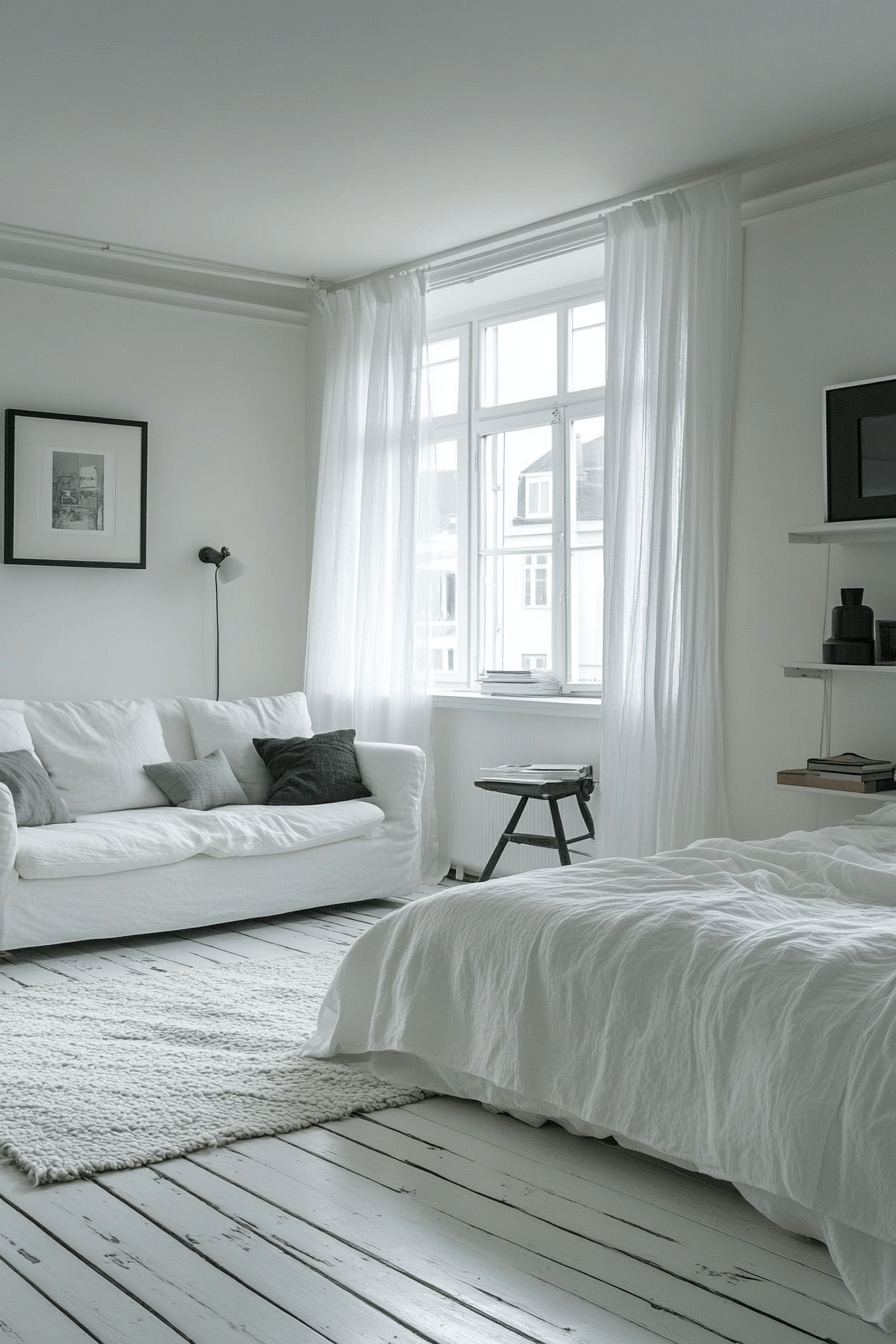 Scandinavian style keeps things light, functional, and welcoming. Natural wood details and simple shapes make the room both pretty and practical. Soft accents add comfort without overwhelming. Sheer curtains let the light flood in.