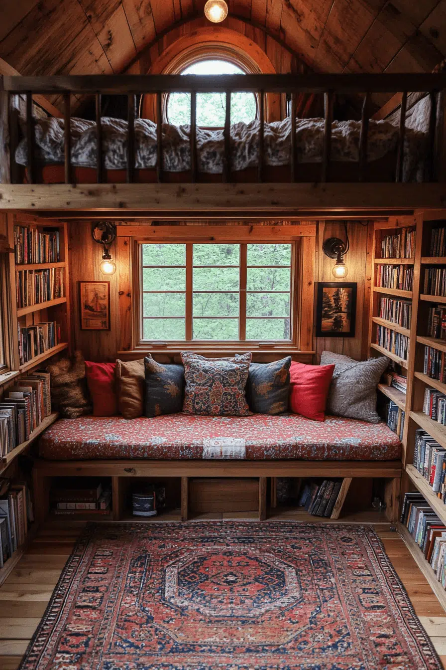 The space beneath a loft becomes a natural relaxation zone in tiny cabins interiors when styled thoughtfully. Soft seating, layered lighting, and compact tables create a cozy retreat. Built-in shelves keep books and essentials within reach. Textured rugs and warm finishes enhance comfort. This often-overlooked area becomes a favorite hangout. Discover under-loft lounge ideas that maximize every inch!