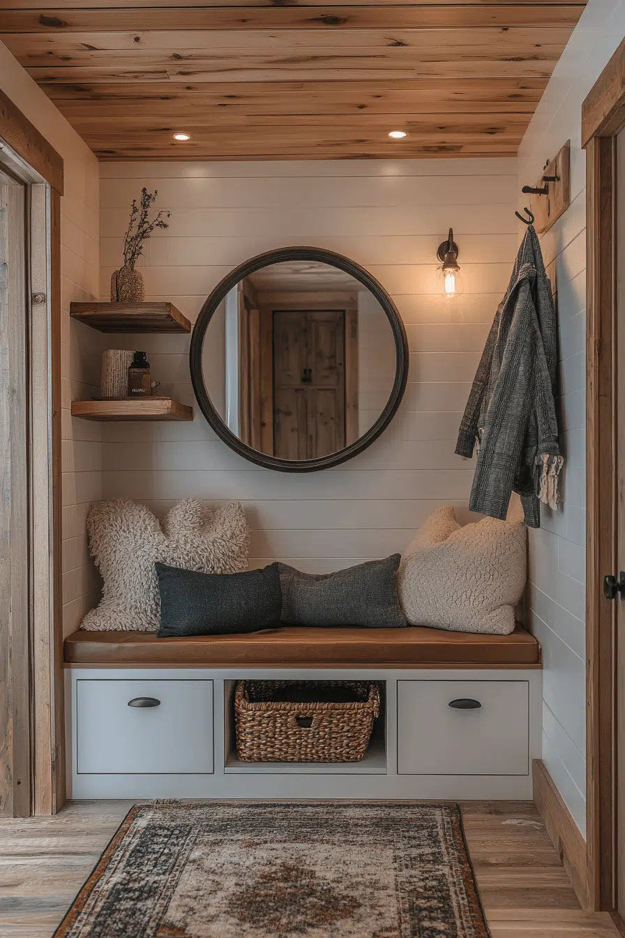 A well-planned entryway sets the tone for organized tiny cabins interiors. Wall hooks, slim benches, and floating shelves store essentials neatly. Mirrors reflect light and expand the visual space. Small bins keep clutter contained. Even compact entrances can feel welcoming. Explore entryway solutions that make tiny cabins feel polished from the start!