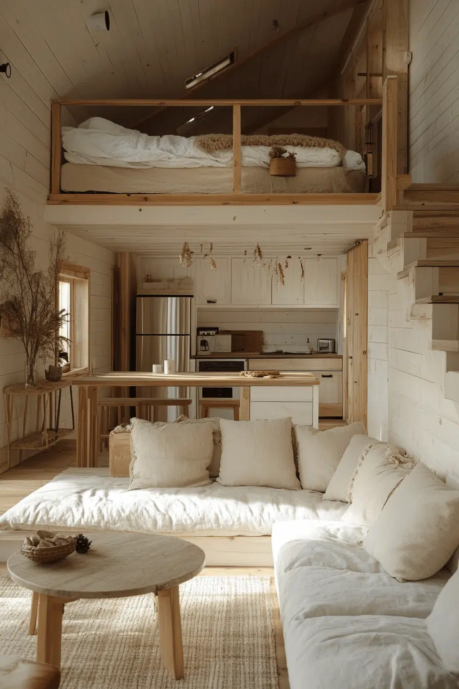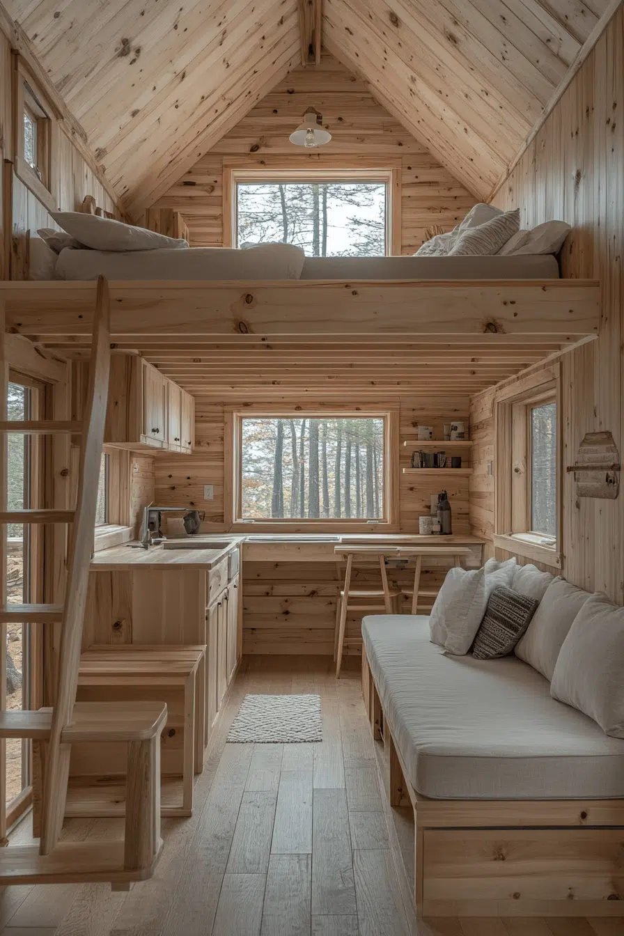 Sleeping lofts create privacy and charm within tiny cabins interiors while preserving floor space. Elevated designs feel adventurous and cozy. Skylights and railings keep the loft airy and safe. Compact beds enhance comfort. It’s a smart vertical solution. Explore loft sleeping ideas that maximize height beautifully!