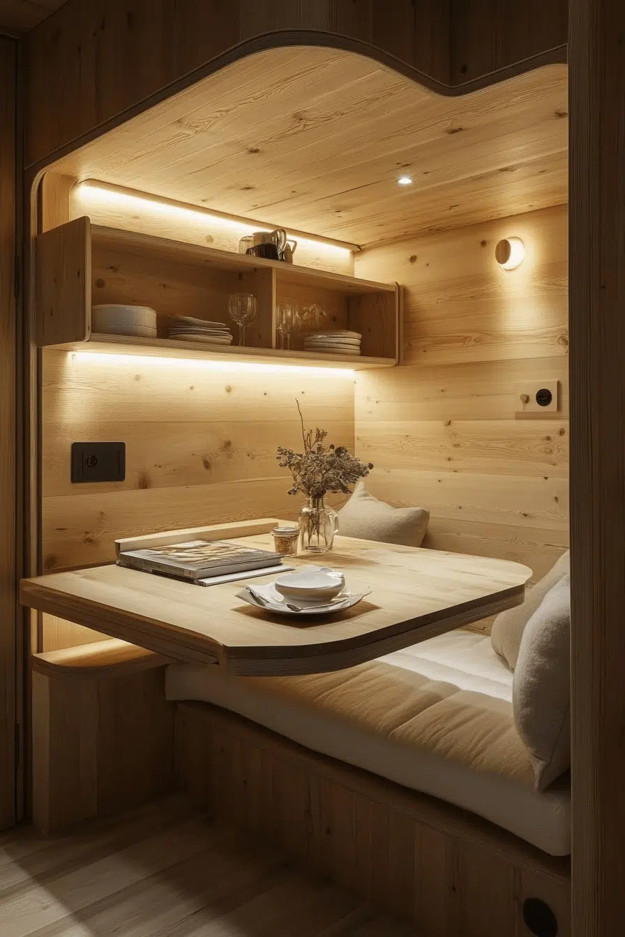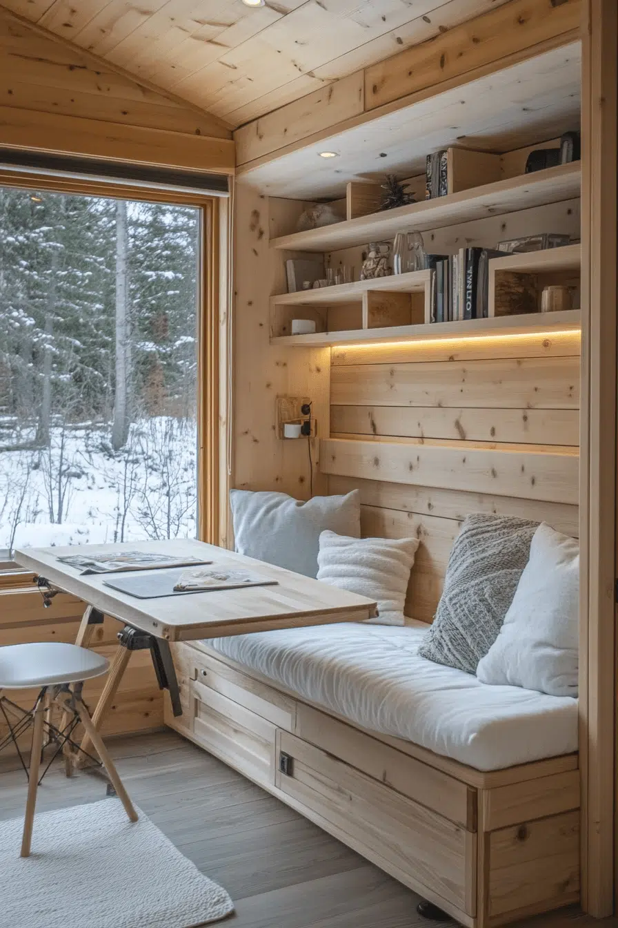 Multi-purpose furniture brings flexibility and freedom to tiny cabins interiors without crowding the space. Convertible beds, fold-down tables, and sleeper sofas adapt effortlessly to daily needs. Each piece works harder while keeping the cabin layout open and fluid. Benches with storage and desks that double as dining areas enhance usability. Minimalist silhouettes ensure everything feels light and intentional. Get inspired by furniture designs that multitask brilliantly in compact cabins!