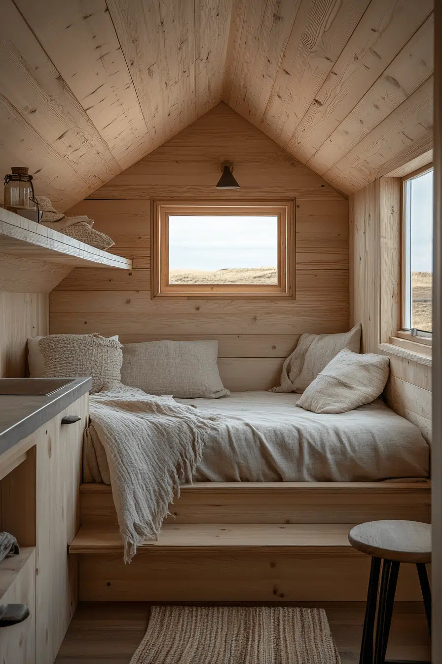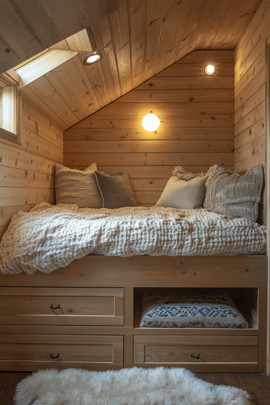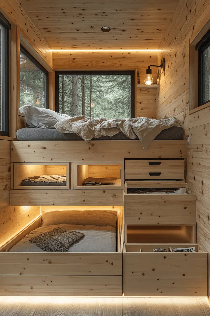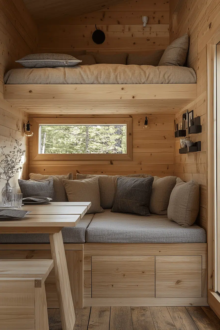 Raised sleeping platforms help define zones within tiny cabins interiors while adding valuable storage below. Separating sleep from living areas creates visual structure in open layouts. Soft railings, cozy textiles, and warm lighting make the elevated area inviting. Storage beneath keeps clutter out of sight. This design adds depth without sacrificing openness. Explore elevated sleep designs that bring balance to tiny spaces!