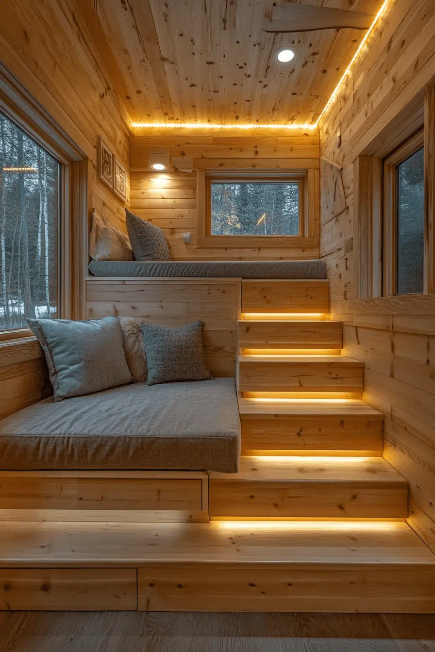 Innovative staircases add style and storage to tiny cabins interiors. Built-in drawers, shelving, or seating make each step functional. Compact designs save space while adding interest. Materials like wood or metal enhance the aesthetic. Every staircase becomes a feature. Discover stair ideas that elevate tiny cabin design!