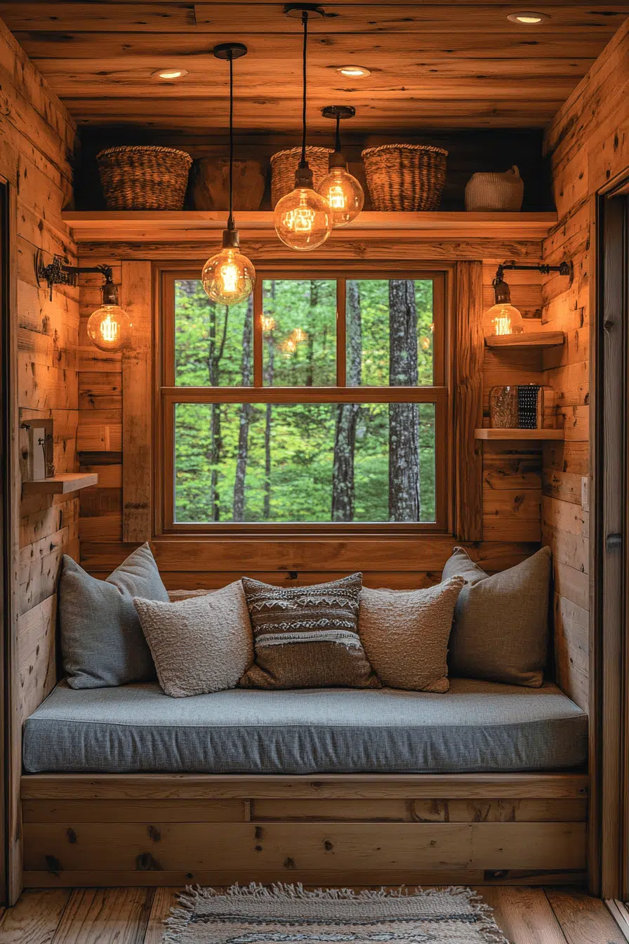 Built-in seating with storage optimizes tiny cabins interiors efficiently. Benches double as drawers or hidden compartments. Cozy cushions enhance comfort without bulk. These spots serve multiple purposes effortlessly. Function meets relaxation. Explore seating ideas that work double-time in tiny cabins!